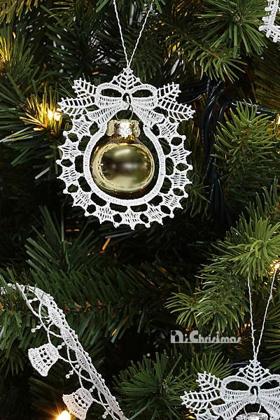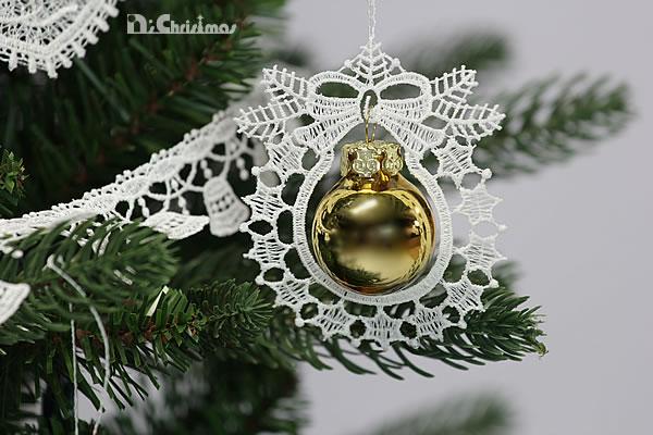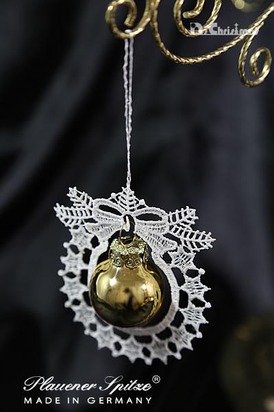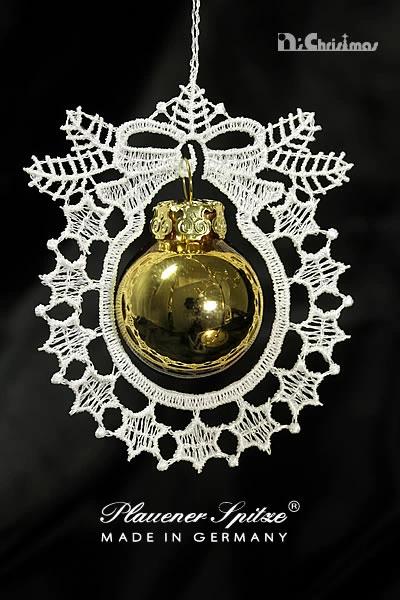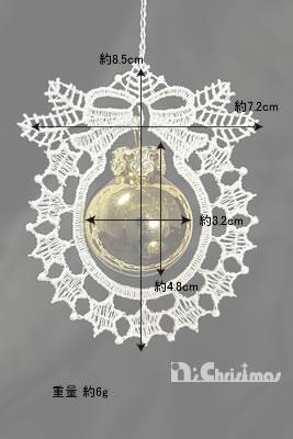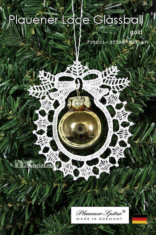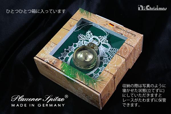 ドイツが世界に誇る高級レースブランド「プラウエンレース」を使用したクリスマスオーナメントです。基本のレースオーナメントにグラスボールを組み合わせたとても綺麗なオーナメントです。精緻なレースもさることながら、ボールの吊るす金属部分にはGERMANYの刻印があり、自信と誇りを感じます。また、とても可愛いBOXに入っているのも素敵です。ボールを吊るすフックまでもがレースでできていますので、ボールが落下しないよう丁寧な取り扱いをお願いします。