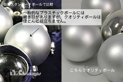 一般的なプラスチックボールは半球を合体させてボール型にするのでその継ぎ目が目立ってしまい、それがチープな感じでがっかりです。クオリティボールはそれをできるだけ目立たないように工夫しています。そんなにがんばってるのにお値段もクオリティなオーナメントです。※表面に若干のこすれがございますのでご容赦ください。