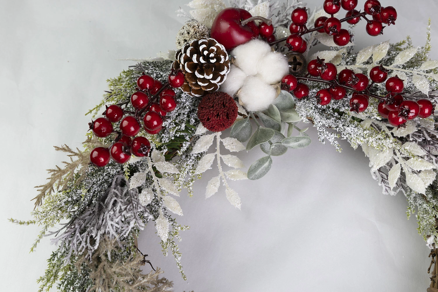 この商品は日本にて熟練した作り手の方々が丹精に仕上げたリースです。部品ひとつひとつを丁寧に配しているのでバランスと完成度が秀逸なのです。ですからシンメトリーなリースと違い、このように飾りが一方に偏ったデザインでも素敵に仕上がっています。