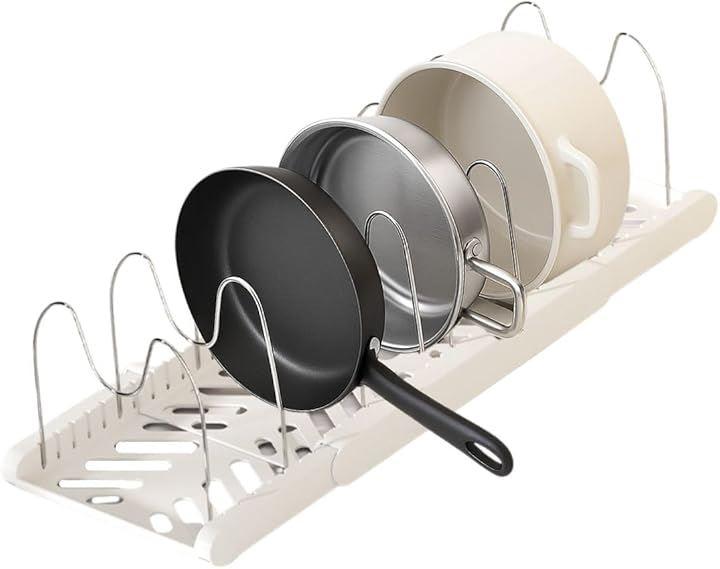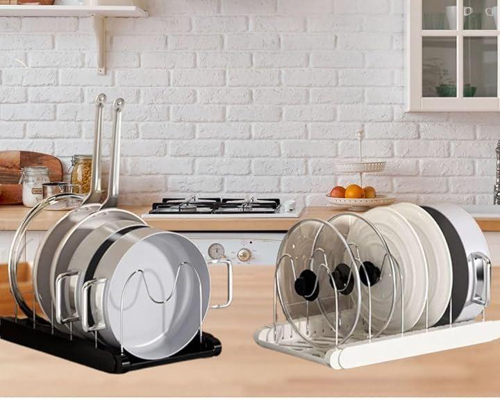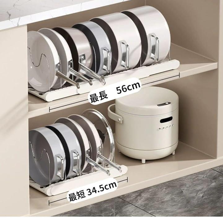 鍋やフライパン、鍋蓋をすっきり整理できる伸縮式収納ラックです。