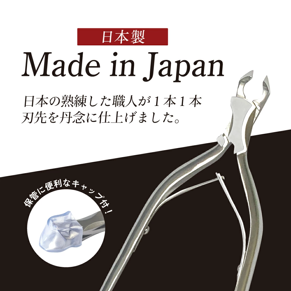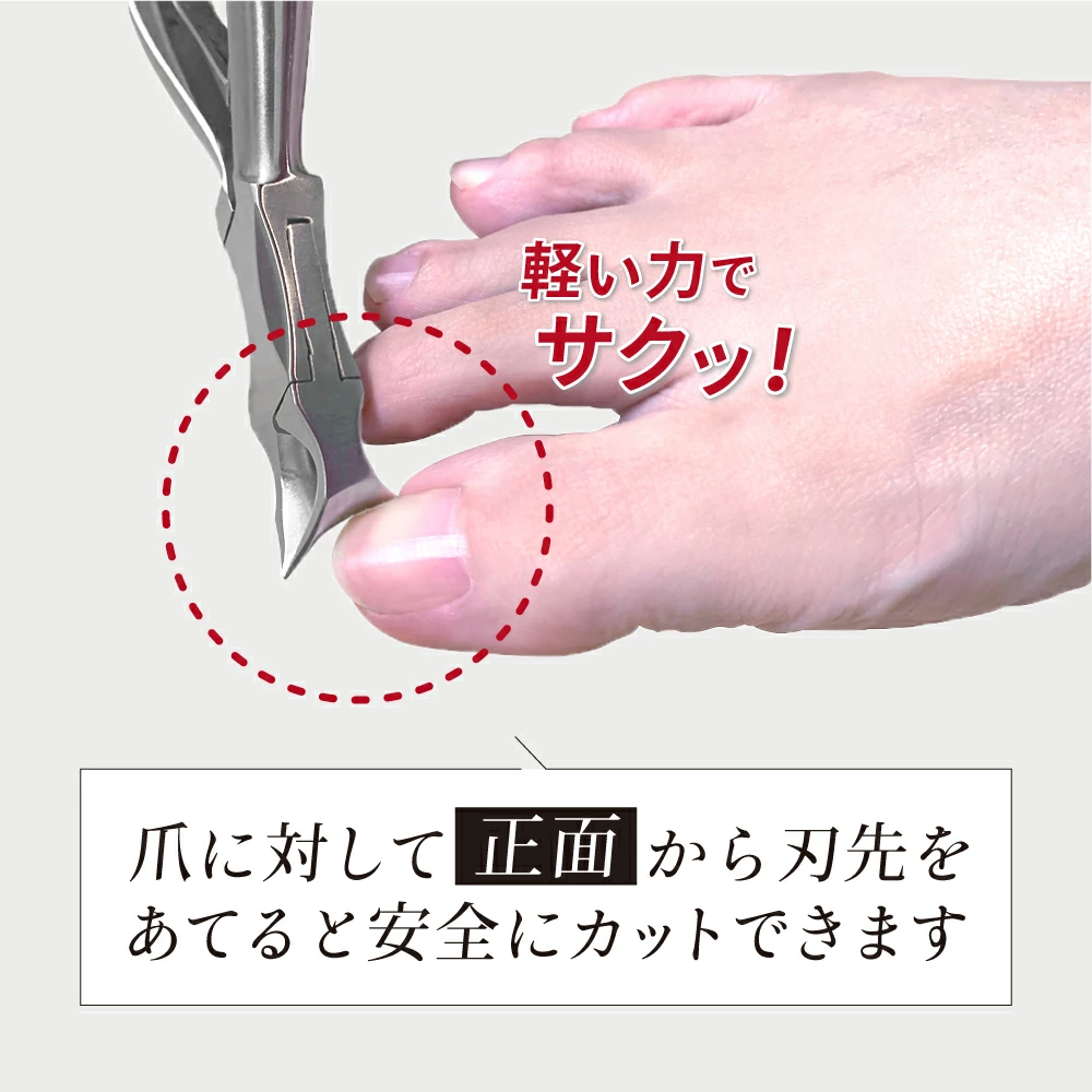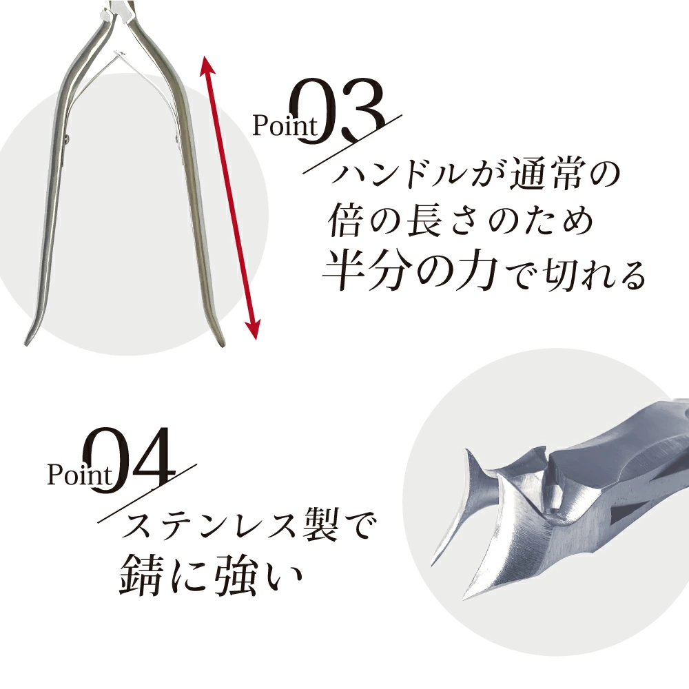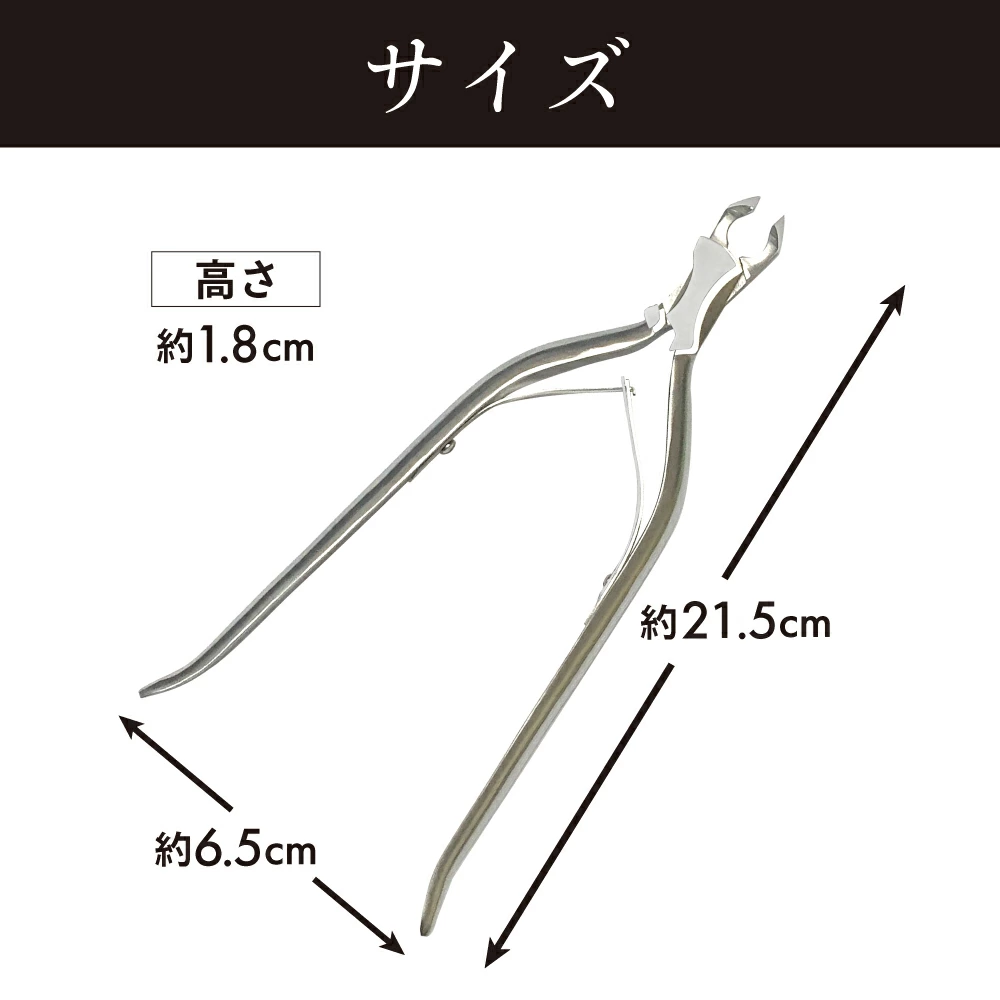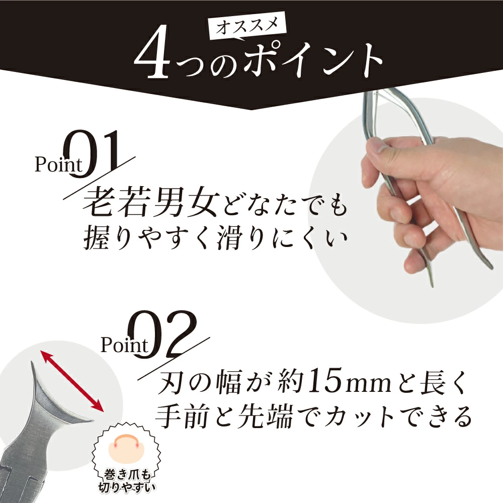 【商品情報】超ロング爪切り 八鉄88029 /4571452048293【商品サイズ】約幅6.5×奥行21.5×高さ1.8cm【材質】本体:ステンレススチール、グリップ:エラストマー樹脂【生産国】日本製・老若男女どなたでも握りやすく滑りにくい、ヘアライン仕上でしっかりしたハンドル形状です。・食い切りという刃先の形状で、爪に対し正面から刃先をあてがうことにより、カットできます。・刃の幅を約15mmと長く設定してあり、刃の手前と先端の両方でカット出来るため、指にくい込んでしまった巻き爪にも入りやすく見やすいため爪に集中してカット出来ます。・ハンドル部を通常90mmから180mmの倍の長さに設定することにより、テコの応用で半分の力しかいらず長いので深く囲まなくても切りやすいです。妊娠中やお腹の出た方、足痛・腰痛で屈みにくい方にオススメです。・ダブルスプリングを採用してバネの金属疲労が少ないため、長きにわたりご使用いただけ尚且柔らかなタッチで使いやすいです。・ヨーロッパで伝統的に使われているデザインを日本的にアレンジ。・ステンレス製で錆に強く長くご使用頂けます。