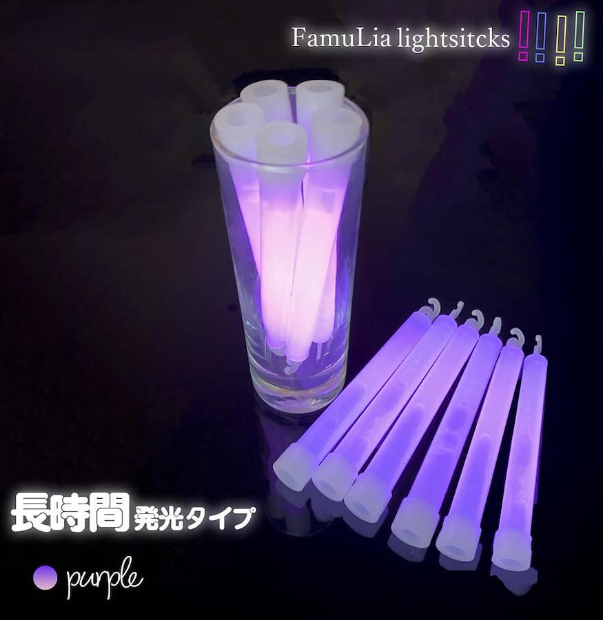 【色】紫(purple)【サイズ】15cm【発光時間】18時間(有効輝度時間:8時間)【ハイコストパフォーマンスのケミカルライト】FamuLia lightsticksは使い捨て用のケミカルライトです。ポキッと折ればすぐに発光。約8~10時間発光し続けます。バルクパッケージですので準備せずすぐに使いたいときに手間なく便利。【用途】パーティー,ライブ,結婚式2次会,各種イベント,キャンプ,防災非常用備蓄用【明るさ】当商品は長時間発光タイプとなります。ライブ等御使用で高輝度をお求めの方は発光時間30分の製品をお求めください。【御利用上の注意】*御利用前の色と実際の発光色は違いますので御注意下さい。・高温、直射日光があたる場所での保管はお避け下さい。変色の原因となります。【免責事項】メーカーによる商品リニューアルに伴いパッケージ(内容量も含む)変更が行われた場合、新パッケージでお届け致します事ご了承願います。