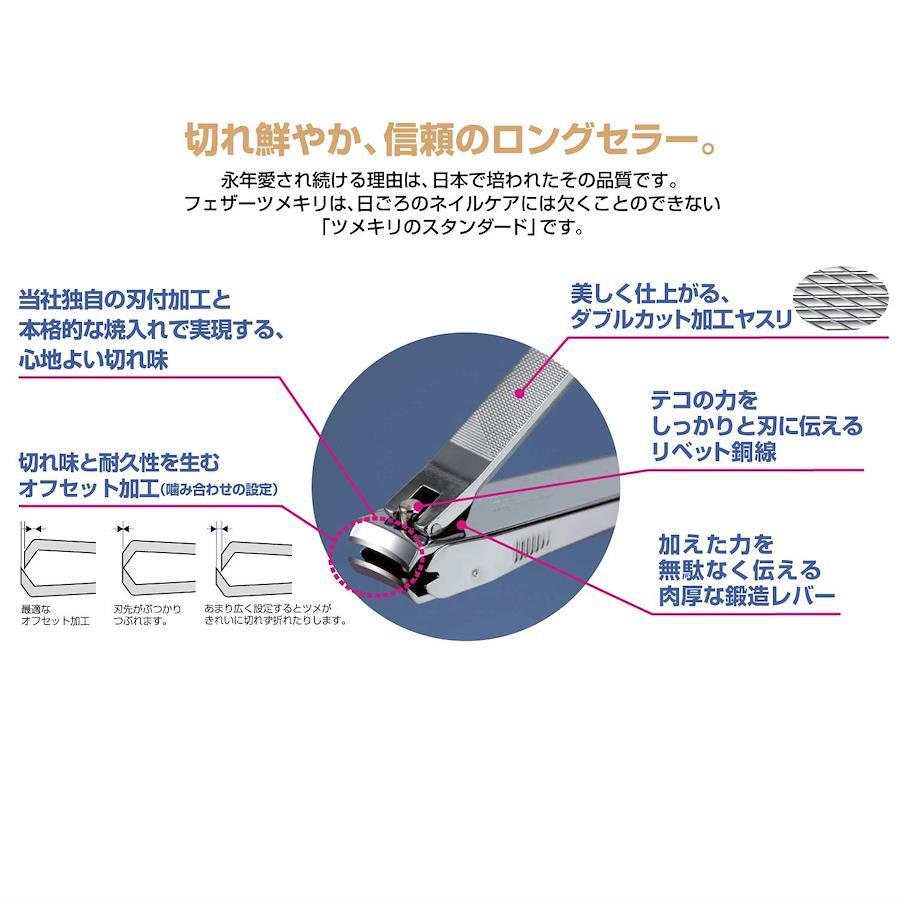 商品紹介●切れ鮮やか、信頼のロングセラー。 こだわりの材質と切れ味を突き詰めた構造。●日ごろのネイルケアには欠くことのできない、フェザーが造り上げた「ツメキリのスタンダード」です。●通常の刃付け後、更に仕上げの刃付けを施す独自の二段階の工程を踏んでいます。●本格的な焼入れ処理をした刃は、強度と弾力をあわせ持