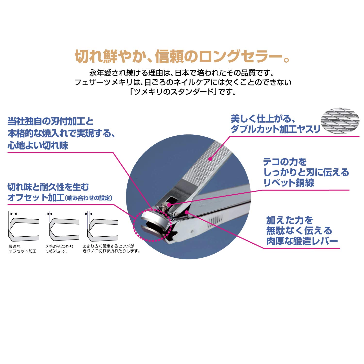 商品紹介●切れ鮮やか、信頼のロングセラー。 こだわりの材質と切れ味を突き詰めた構造。●日ごろのネイルケアには欠くことのできない、フェザーが造り上げた「ツメキリのスタンダード」です。●通常の刃付け後、更に仕上げの刃付けを施す独自の二段階の工程を踏んでいます。●本格的な焼入れ処理をした刃は、強度と弾力をあわせ持
