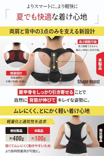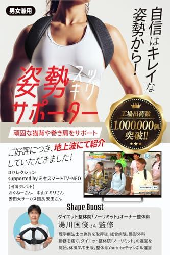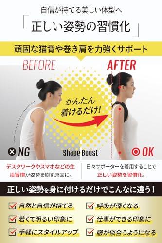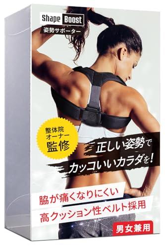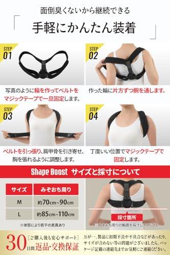 ①【正しい姿勢でカッコいいカラダを!】現代人はパソコンやスマホを使用する時間が長いせいでどうしても猫背、巻き肩など姿勢が乱れがち。自分で意識して姿勢を正してもいつの間にか戻ってしまい、なかなかキレイな姿勢を保つのは難しいものです。そこで整体院オーナーの湯川国俊さん監修のもと開発されたのがShape Boostの姿勢サポーターです。着用することで肩甲骨を引き寄せ、胸を張り、背筋を伸ばすことができ、正しい姿勢を身に付けられるようにサポートします。 ②【脇が痛くなりにくい高クッション性ベルト採用】従来の姿勢サポーターは着用時に脇が痛くなることが多く、そのせいで長時間着用することが難しいという問題点がありました。Shape Boostではその点を改善して十分な厚みがある高クッション性ベルトを採用。これにより快適な着け心地になり、無理なく継続しての着用が可能になりました。 ③【気軽にいつでもどこでも】Shape Boostの姿勢サポーターは、仕事しながら、スマホを触りながら、TVを見ながら、ゲームをしながら、家事をしながら・・と何かをしながら別途お時間をとらずに着用することができます。最初は10分-15分位から始めていただき、体が慣れてきたら少しずつ着用時間を延ばしてください。体型はそれぞれ異なりますので、実情に合わせて装着時間を調整してください。 ④【2サイズで男女兼用】みぞおち周りを採寸していただき、Mサイズ:約70cm?90cm、Lサイズ:約85cm?110cmの方が対象となります。※体型により若干の差異有り。標準体型の女性と、細身?標準体型の男性はMサイズ、体格がいい男性はLサイズがいいと思われます。商品到着より30日以内でしたらサイズ交換させていただきますので安心してお買い求めください。 ⑤【こんな方にオススメ】長時間のデスクワーク、スマホ操作、読書、ゲームをされる方におすすめです。長時間の同じ姿勢、間違った姿勢にならないように着用するだけでサポートします。正しい姿勢の習慣化で理想の美しい姿勢を身に付けましょう。 ⑥【安心の日本企業】商品の使い方でお困りの際や、初期不良の対応などは全て日本語で行なっております。よくある「問い合わせをしたけど返信がない」「返信はあったが日本語が通じない」等のトラブルはありませんので安心してお買い求めください。※お問い合わせ先は商品の取扱説明書に記載されております。 ⑦【30日間保証】商品に不具合等ありましたら、商品到着より30日間は返金対応などの保証を行なっております。何かお困りごとがございましたらお気軽にお問い合わせください。