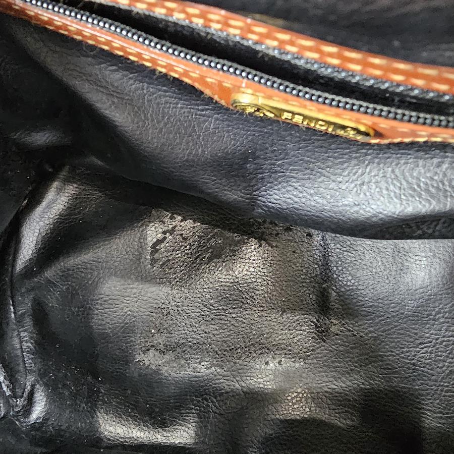 内部: 【重要】内側の合成皮革ライニングに、広範囲にわたる剥がれ(粉吹き、劣化)が見られます。現状、内袋をご理解いただければと思います。