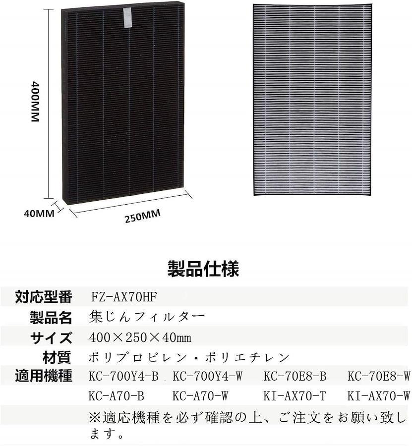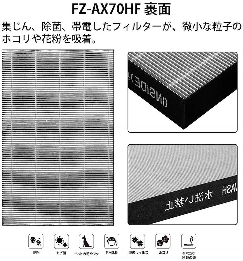 3営業日以内に発送≪新品未開封品≫:加湿空気清浄機 交換用集じんフィルター FZAX70HF HEPAフィルター 互換品 1枚。 対応型番:FZ-AX70HF 対応機種:KC-700Y4-B、KC-700Y4-W、KC-70E8-B、KC-70E8-W、KC-A70-B、KC-A70-W、KI-AX70-T、KI-AX70-W 捕集機能:ペットの毛、花粉、チリ、ホコリ、ペットの毛などを捕集できます。
