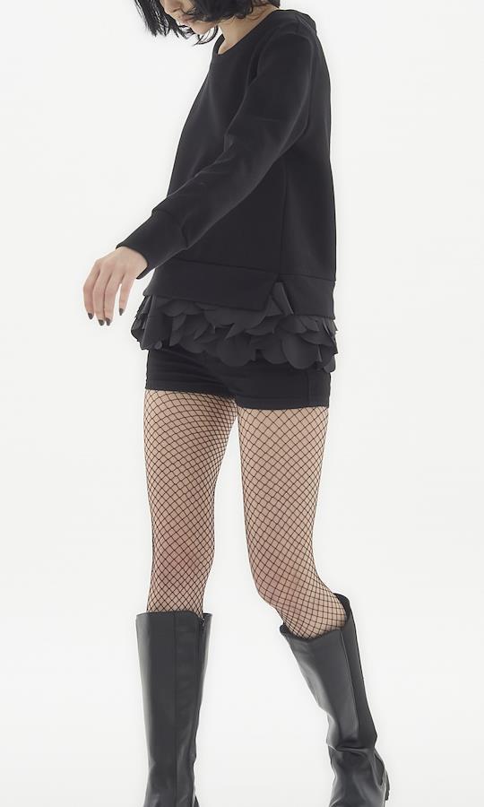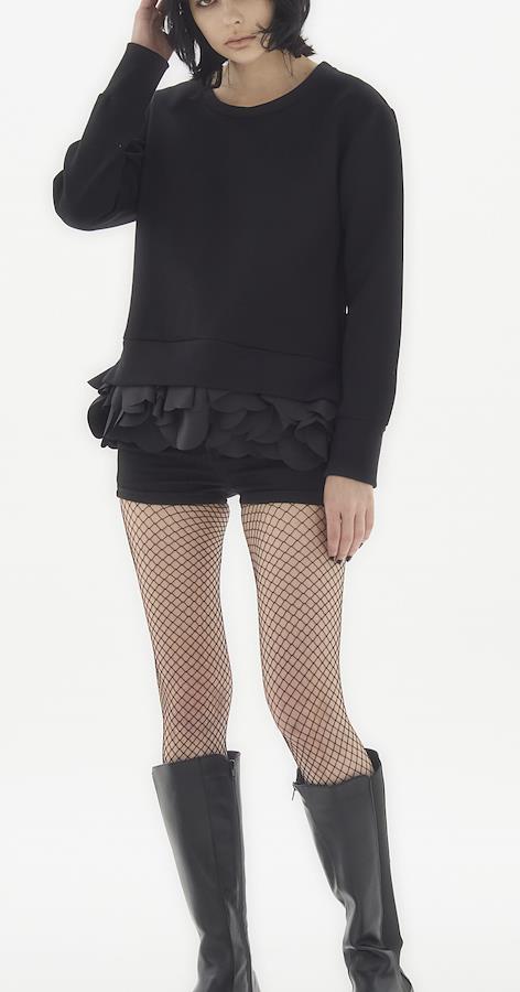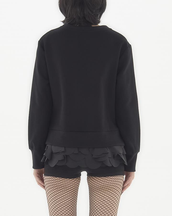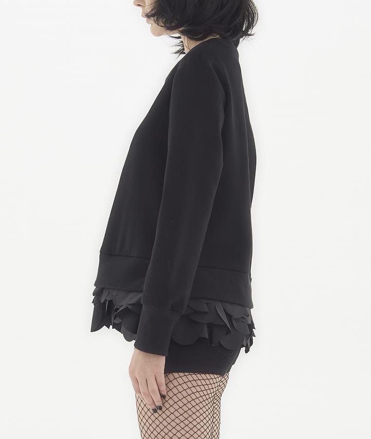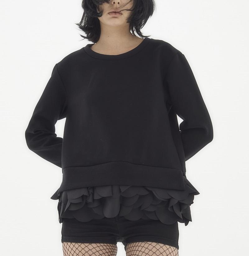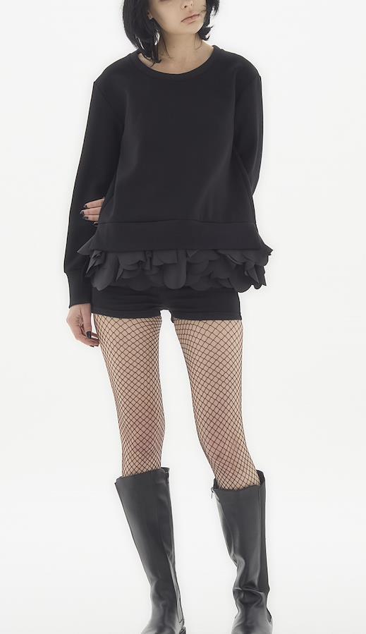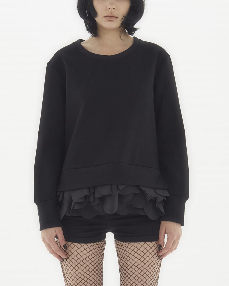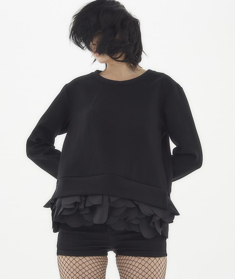モードな雰囲気漂うルーズフィットのプルオーバー。裾にはレーザーカットで精密に仕上げた花びらモチーフを2枚重ね、立体感のあるデザインに。素材には、肌触りがよく適度なハリ感のあるダンボールニットを使用。軽やかな保温性があり、肌寒さが残る時期に最適。カジュアルにもモードにも着こなせる万能アイテムです。