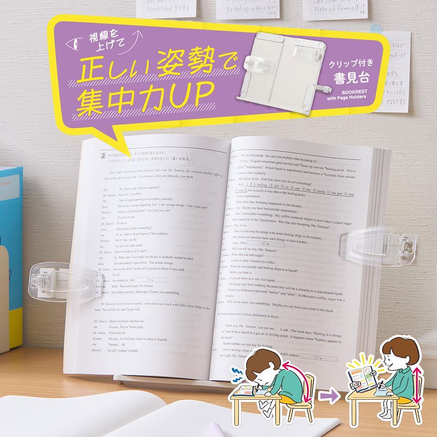 【クリップ付き書見台】大きな透明クリップで分厚い本やタブレットも内容を隠さずしっかり固定できるブックスタンド。クリップとサポートアームをスライドさせることでA4(見開きA3)サイズまで対応可能。角度も12度ごとに180度調節可能です。タブレットや本を立てることでスペースの効率化はもちろん、視線を上げて背筋を伸ばした正しい姿勢をサポート。お子様の学習から大人のデスクワーク、料理中のレシピ立てなど幅広く使えるアイテムです。