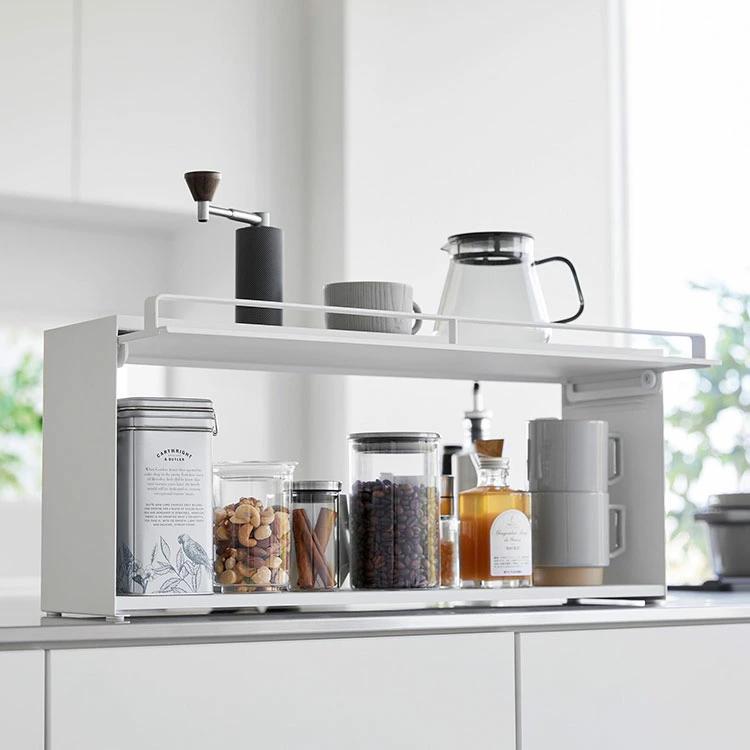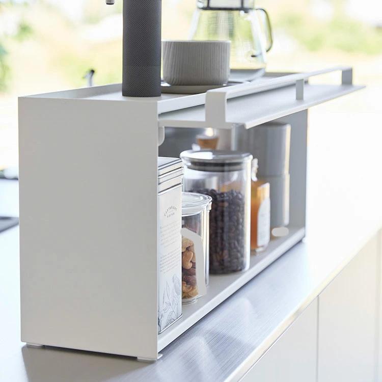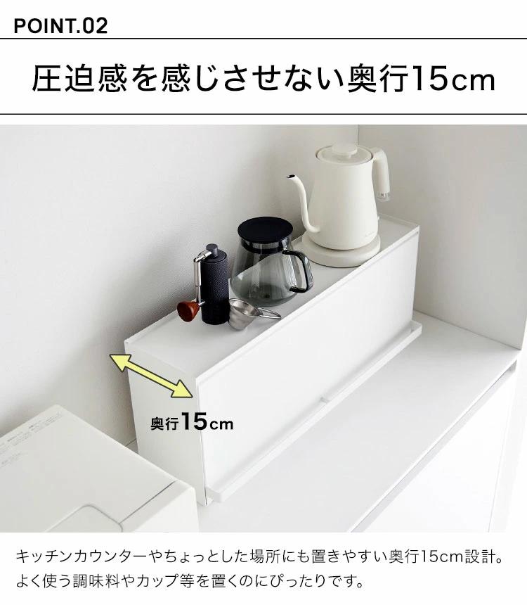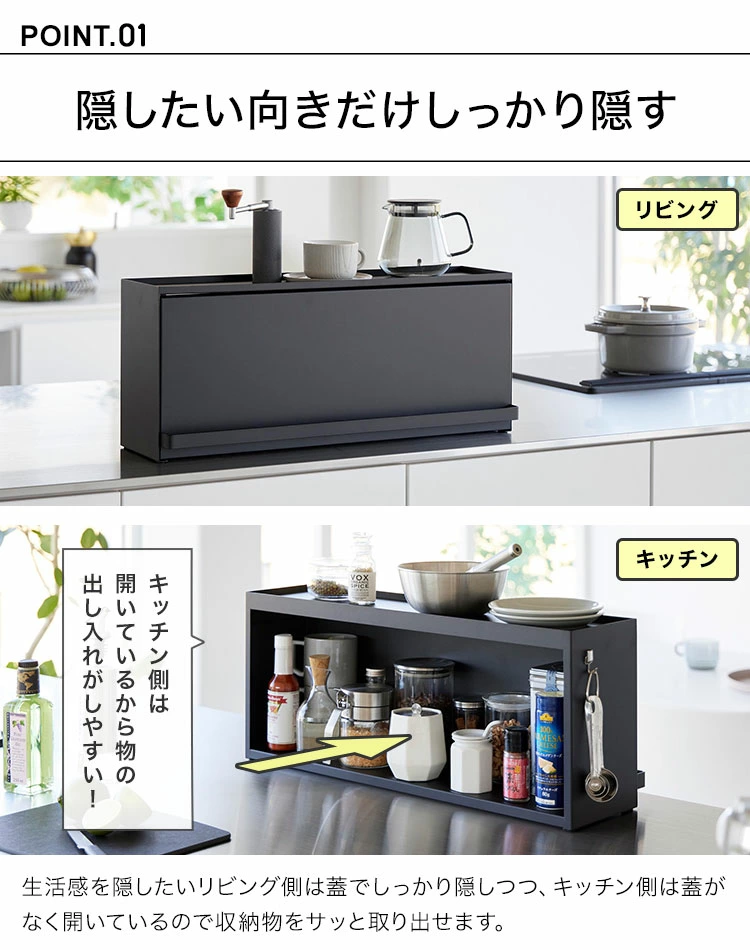 【前が開くキッチンカウンター上収納ラック D15】リビングからはスッキリ隠せて、キッチンからは使い勝手の良さが嬉しい。奥行き15cmのカウンター上収納ラックです。リビング側は全面が開くフラップ式の扉なので、中の物も取り出しやすいです。キッチン側は扉がないのでサッと物の出し入れがしやすいです。壁際に設置すればブレッドケースとしても使用できます。スチール製なのでマグネットが付き便利です。