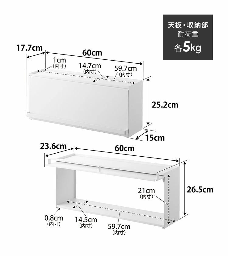 ■サイズ扉を閉じた状態:約W60×D17.7×H25.2cm扉を開けた状態:約W60×D23.6×H26.5cm天板:約W59.7×D14.7×H1cm収納部:約W59.7×D14.5×H21cm ( 有効内寸・ローラー部含まず )