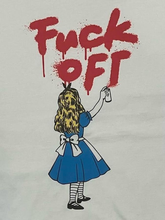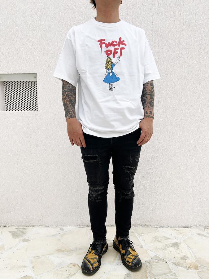 パンクテイストなグラフィックが目をひくTシャツ。後ろ姿のアリスがキュート♪男女問わず着用可能なS,M,Lの3サイズです。