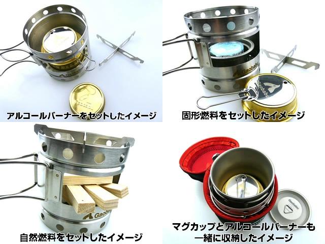 ※トランギアやエスビット他 アルコールバーナーをお使いの「アルスト」ファンには特にオススメです。※アルコールバーナーはもちろん「Gaobabuチタンマグカップ 400ml」や「Gaobabuステンマグカップ 400ml」も内部に収納出来ます。※上記Gaobabuのマグカップは専用クロス五徳にジャストフィットします。※使用中・使用直後はたいへん熱くなります。必ず手袋を使用し取り扱いには十分注意して下さい。
