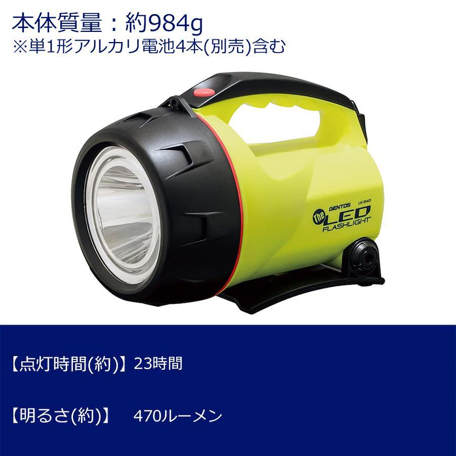 -サイズ:約幅125×奥行190×高さ148mm、本体重量:約984g (電池含む)セット内容・付属品:本体、ショルダーストラップ明るさ:470ルーメン、使用電池:単1形アルカリ電池×4本 (別売り)実用点灯:23時間機能:1m落下耐久、防塵・防滴仕様 (IP54準拠)、最大照射距離:約459m