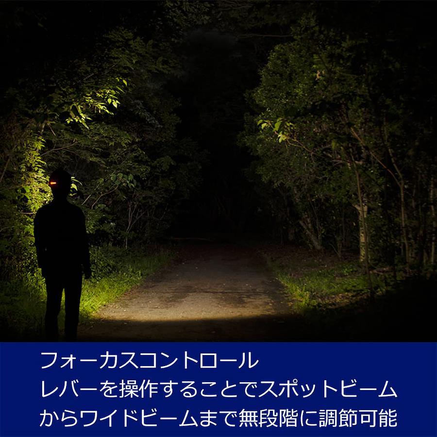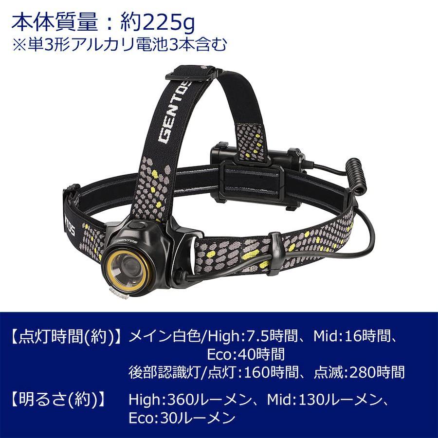 【ヘッド部】ヘッドプッシュスイッチ、【電池ボックス部】サイドプッシュスイッチサイズ(約):ヘッド部/幅69.4×奥行40.5×高さ45.5mm、電池ボックス部/幅84.8×奥行30.4×高さ53.8mm、本体重量:約225gセット内容・付属品:本体、ヘッドバンド、テスト用電池(単3形アルカリ電池×3本)明るさ:High/360ルーメン、Mid/130ルーメン、Eco/30ルーメン、使用電池:単3形アルカリ電池×3本 または 専用充電池(別売り)実用点灯:High/7.5時間、Mid/16時間、Eco/40時間、後部認識灯 点灯/160時間、後部認識灯 点滅/280時間機能:1m落下耐久、耐塵・防滴仕様 (IP64準拠)、最大照射距離:約135m