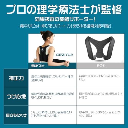 【心込めた姿勢サポーター、究極の製品!!】DEZIYUA姿勢サポーターは、現代人の脊椎の健康を守るために生まれました。調査データによれば、18歳以上の成人の23%以上が1日5時間以上もパソコンやスマホに没頭していることが判明しました。この生活様式が原因で、現代人は運動不足や筋肉不足に陥り、猫背のリスクが高まっています。こうした状況が続くと、体の姿勢や基本的な代謝も悪化し、自信と健康が失われがちです。 Deziyua社はこの問題に真剣に取り組み、専門の姿勢指導先生による監修も受け、一年以上にわたる研究と努力の末、この猫背ベルトが誕生しました!この姿勢サポートベルトは、シンプルでありながらも軽薄なデザインで、背部に最強のサポートを提供します。「無理」なく、「無痛」で、「無意識」のうちに猫背を補正し、最も美しい姿勢へと導いてくれます!DEZIYUAは、姿勢健康に真摯な思いを込めたデザインの原点です! 【最高補正力のヒミツ 、もう猫背に戻れない!!】一部の姿勢サポーターがサポート力のないベルトだけ構造か、簡単に折れやすいプラスチックボーンで支えられているものがあり、実際の補正効果がないという問題があります。この一連の課題に対処するため、当社は日本の理学療法士島﨑 裕樹さんを特別に顧問に迎え、人体工学の構造に依存して、丹精込めて「金属ボーン」版背筋サポーターを開発しました。装着すると、瞬時に背中が引っ張られるような心地よさが感じられます!そして、長時間着用しても安定したサポート力を提供し、無意識にいつも姿勢を保ち、簡単に崩れ落ちることはありません。これがDEZIYUA 姿勢 ベルト優れた補正力の「コアな秘密」です!金属の骨は背筋サポーターの夾層に巧妙に組み込まれており、刺さることもなく、目立たないデザインで装着時にも軽快で負担を感じません。 【これ一枚で姿勢が変わる!!美姿勢へ~】 DEZIYUA 姿勢サポーターは、あなたが正しい姿勢を手に入れるための秘密の武器です!それは巻き肩や丸まった肩など、様々な姿勢の問題を補正し、同時に背中の筋肉に強力なサポートを提供します。仕事、家事、運動、学習、外出中など、この姿勢ベルトは背中全体にしっかりフィットし、無意識に正しい姿勢の習慣化をサポートします。 毎日わずか2時間の装着を続けるだけで、たった21日で身体にポジティブな変化を実感でき、美しい姿勢を手に入れることができます。本当の姿勢美人になり、自信を取り戻しましょう! 注意事項: 初めて姿勢サポーターを着用する際には、少し違和感を感じるかもしれませんが、心配しないでください。着用時間を適度に短縮し、徐々に慣れるようにしてください。自分の身体を大切にするための一歩として、Deziyua 背筋ベルトを自信を取り戻すパートナーとして活用してください! 【究極に生地・サポート力両立、最高な使用感を!!】猫背姿勢ベルトは、高弾性綿素材を使用しており、肩ベルトとウエストベルトは身体に完璧にフィットし、あらゆる体型の方に適しています!また、肩ベルトが着脱式の脇クッションが付き、脇の下にさらに快適感を持ってく来ます!背部は全体を覆うエアメッシュ素材で構成され、より効果的な補正力を提供すると同時に、通気性が確保されており、夏場でも蒸れずに快適です!ベルトはたったの200グラムで、装着時にはまったく負担に感じません。また、服の下での着用でも一切目立たず、外出時に他人の視線を気にする必要がありません。プライバシー保護と快適な着用を両立させます。 【どんな体型にフィット!幅広い用途・2年付き保証】猫背ベルトはS~XLサイズが揃っており、あらゆる体型の人に適している。さらに、過去の類似品のフィードバックを集計し、肩ベルトにクッションパッドを追加して、脇の下の摩擦圧を軽減し、快適性を向上させました。肩ベルト、ウエストベルト、高さが調節可能で、個々の体型に合わせて、最適なサポート力に調整できます。この姿勢ベルトは正しい姿勢の指導が必要な学生、肉体美を目指す若者、筋力が衰えてきたお年寄りへのプレゼントに最適です。日本語の取り扱い説明書が付属し、2年間の保証付きますので、サイズや使用方法に関するご質問があれば、いつでもお気軽にお問い合わせください。24時間以内にご満足いただける回答を差し上げます。Mサイズ適用ウエスト範囲:72~87CM