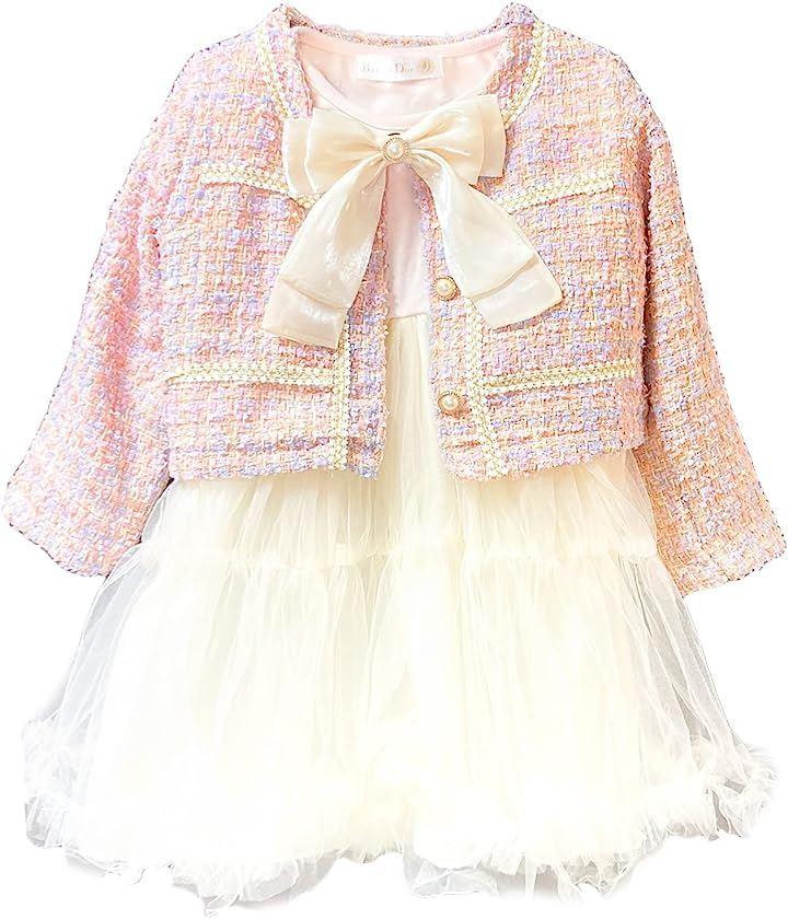 ピンクのジャケットと、ふわふわチュールが可愛いらしいワンピースのセットアップドレスです。