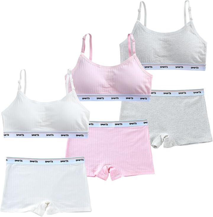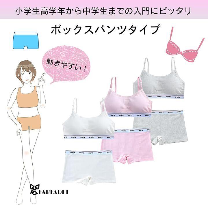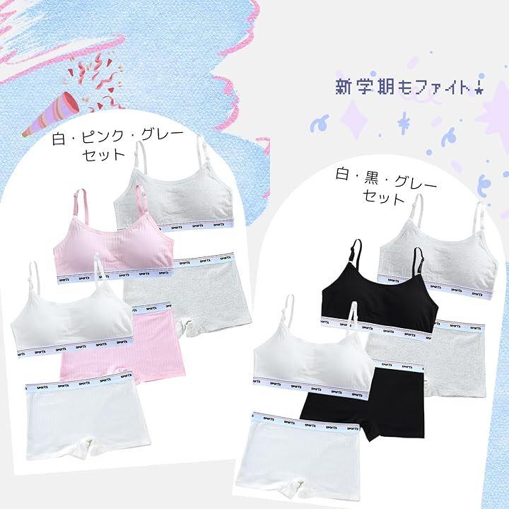 柔らかなリブ生地を使用したジュニア用ブラジャー&ボクサーパンツの上下を3色セットにしました。