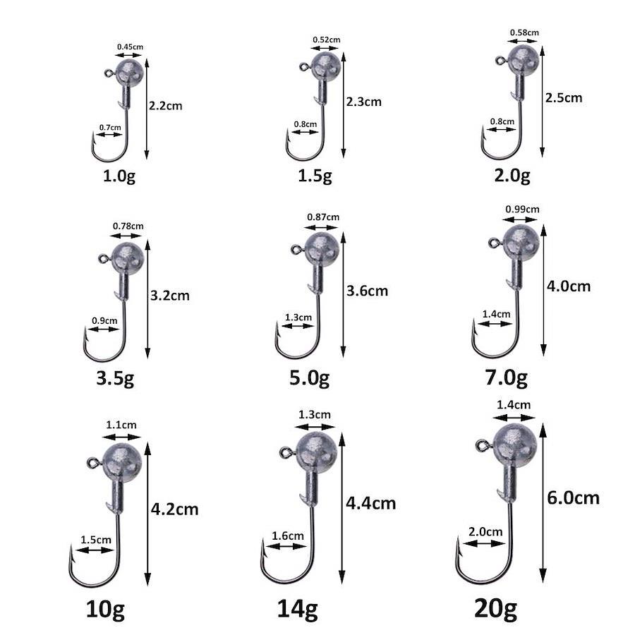 丸型ジグヘッドの重さ:1g/1.5g/2g/3.5g/4g/10g/20g