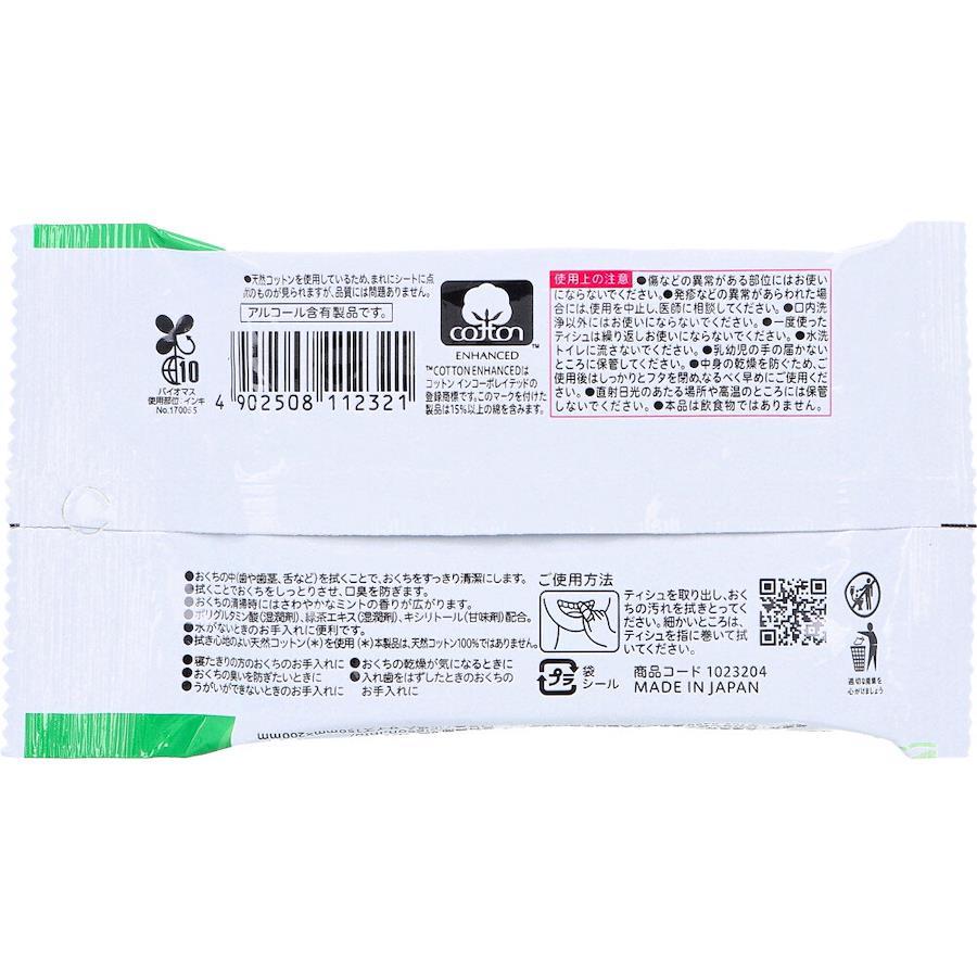 サッと拭きとる凸凹シート。●おくちの中(歯や歯茎、舌など)を拭くことで、おくちをすっきり清潔にします。●拭くことでおくちをしっとりさせ、口臭を防ぎます。●おくちの清掃時にはさわやかなミントの香りが広がります。●ポリグルタミン酸(湿潤剤)、緑茶エキス(湿潤剤)、キシリトール(甘味剤)配合。●水がないときのお手入れに便利です。●拭き心地のよい天然コットンを使用。※本製品は、天然コットン100%ではありません。●アルコール含有製品です。●寝たきりの方のおくちのお手入れに・おくちの臭いを防ぎたいときに・うがいができないときのお手入れに・おくちの乾燥が気になるときに・入れ歯をはずしたときのおくちのお手入れに。●携帯しやすい10枚入。