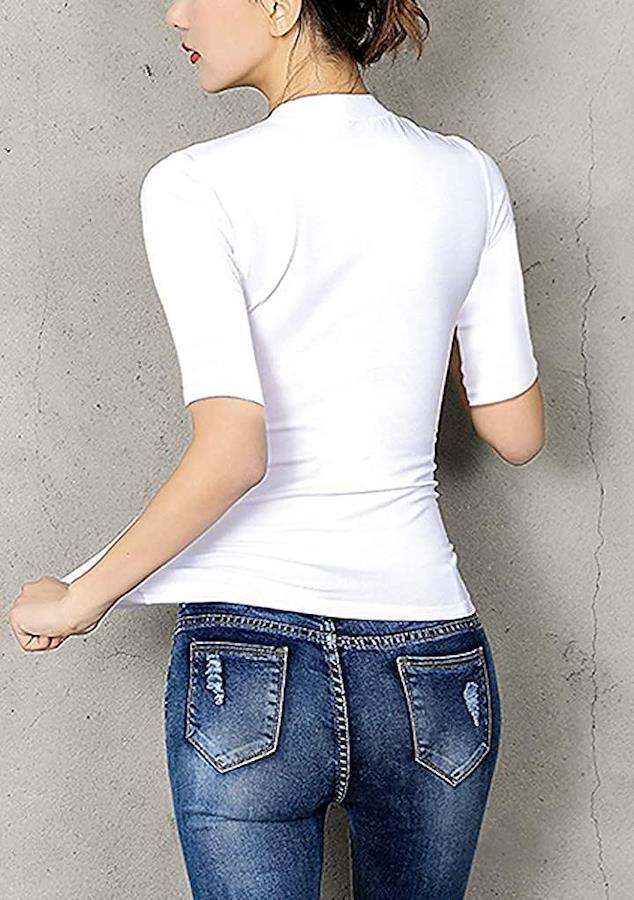 肘までの五分袖が二の腕をスッキリ見せてくれます。