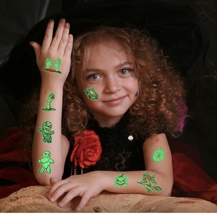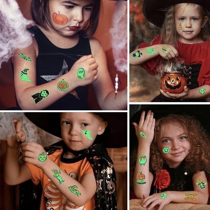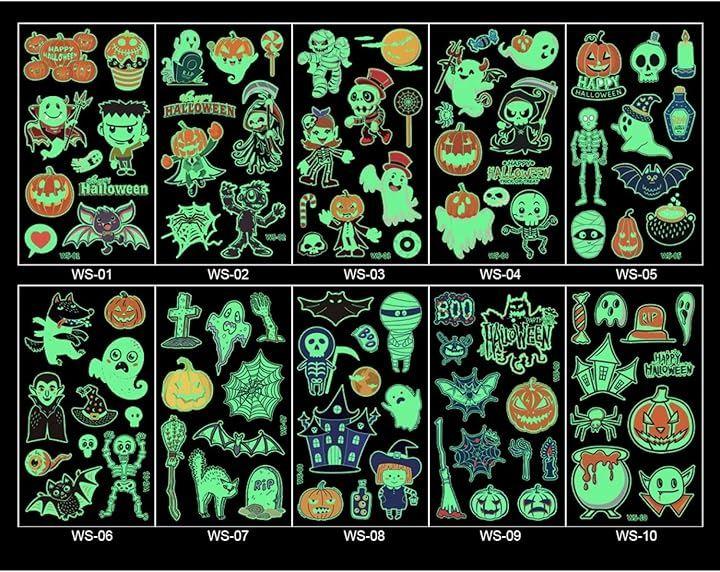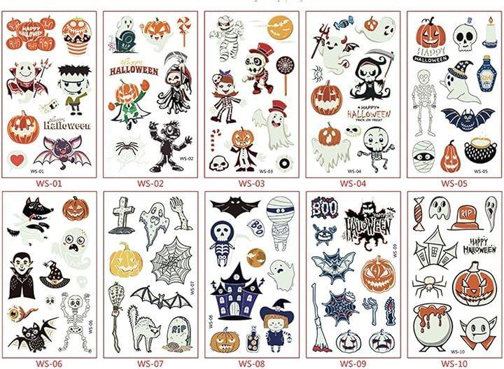 「お得セット、10枚入り」:10枚タトゥーシール;各枚サイズ:6.8cmx12cm;カボチャ・バンパイヤ・ドクロ・コウモリ・おばけなどの様々な図柄。