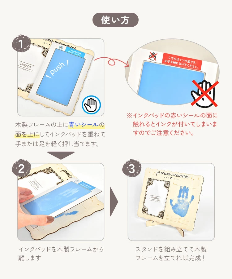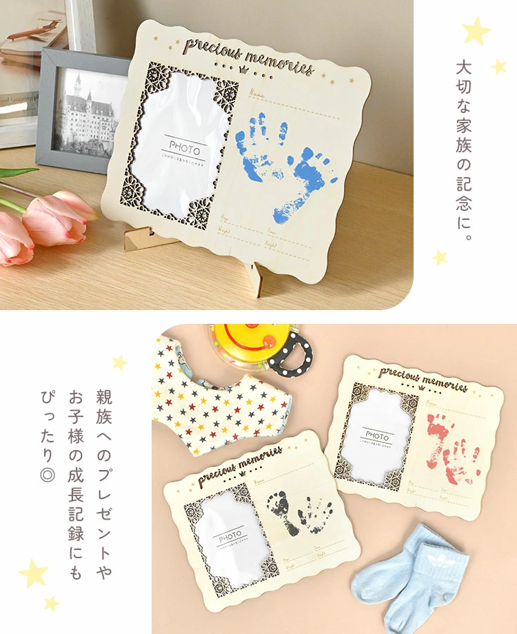 【手形足形スタンプウッドフレーム】お子様の手形・足形をおしゃれに残せるスタンプフレーム。手足を汚さずに押せるインクパッドで、赤ちゃんも簡単に安心して使えます◎木製フレームは組み立てるとスタンドになるので、写真を入れてフォトフレームとして飾れます♪お部屋にも馴染むシンプルなデザインです。今しかないかけがえのない瞬間、記念日などの節目に大切な思い出を残しませんか?