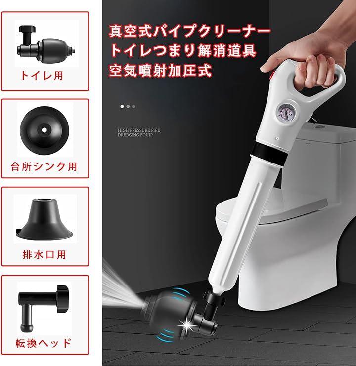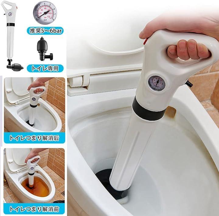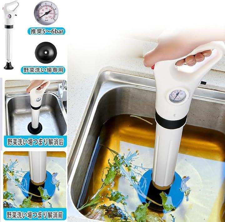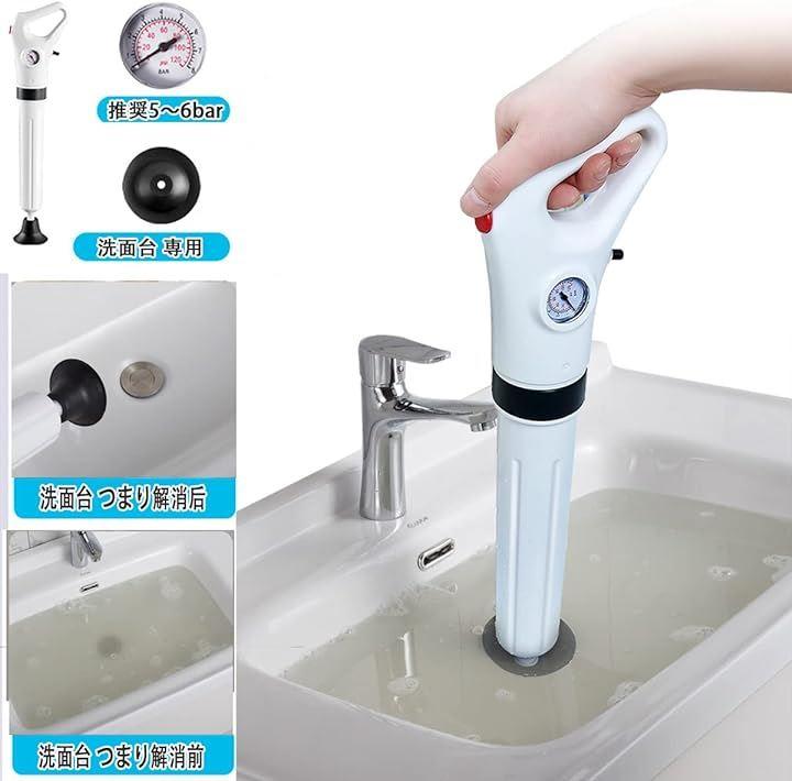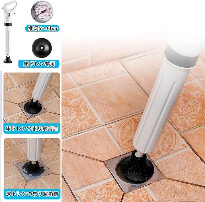 メモリタイプの空気圧力計が付いてるので、空気の入れすぎなどを防ぎ、用途によって空気圧を加減でき、排水溝やトイレの破損、汚水の逆噴射などを防ぐことができます。