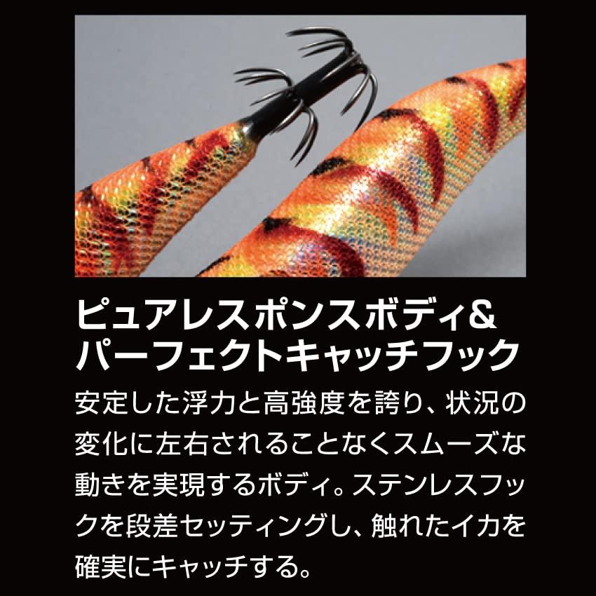 TIE UPオリジナルカラーモデル。ハイポテンシャル&高バランス設計。使い手の意思をダイレクトに伝えるため、あえて固定式のラインアイを採用(フィックスドSUSアイ)。ムダな贅肉をそぎ、シャープ&クイックなダートを可能にするノーズ(スリムノーズ)。最大の特徴である独特のシンカー形状。下部を太くすることで「水かみ」が良くなり、軽い力でキレ良く幅広いダートを演出(ヘキサゴンシンカー)。安定した浮力と強度を誇り、状況の変化に左右されることなくスムーズな動きを実現するボディ(ピュアレスポンスボディ)。ステンレスフックを段差セッティングし、触れたイカを確実にキャッチする(パーフェクトキャッチフック)。