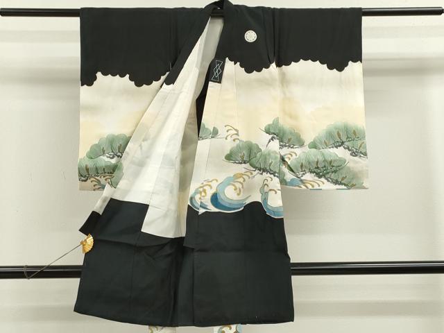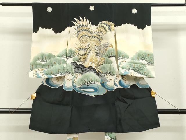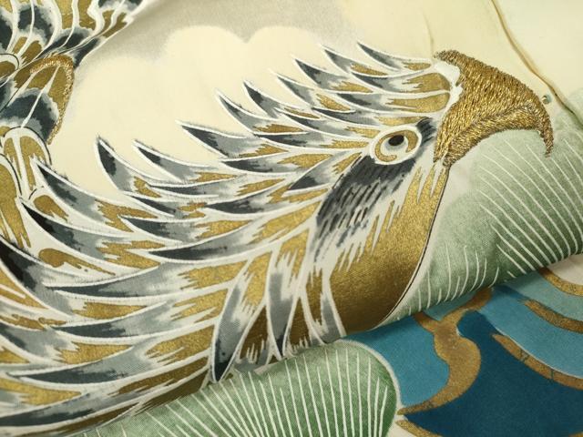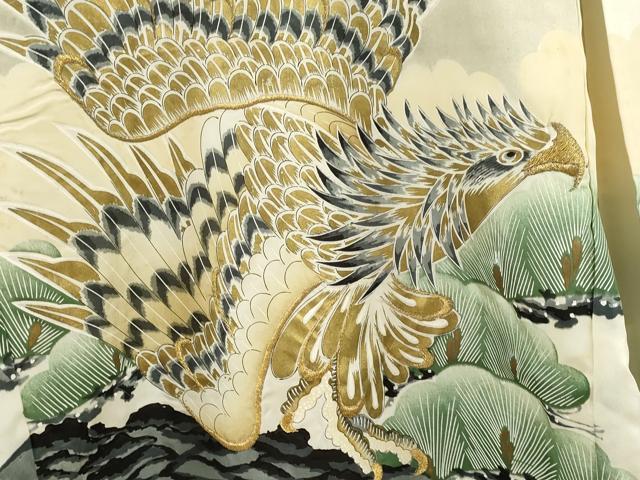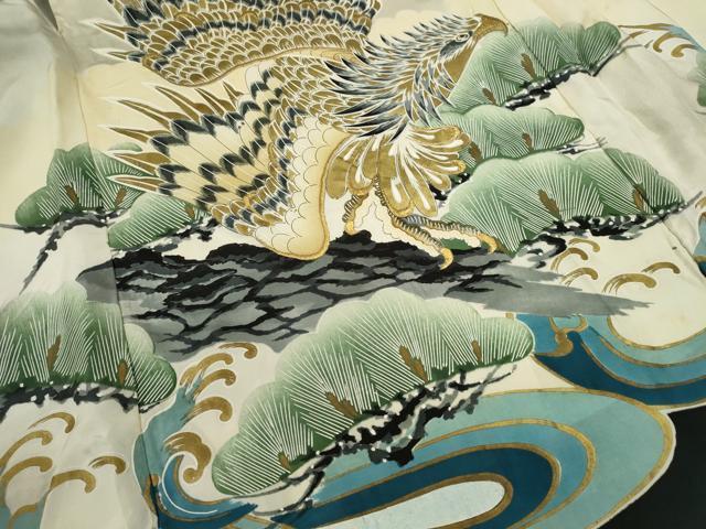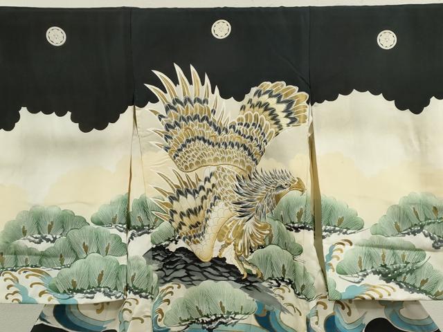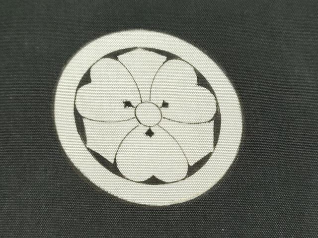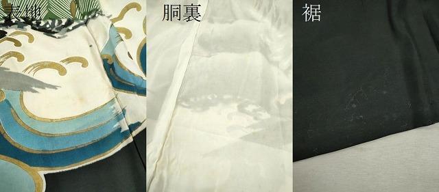 産着【表地:正絹・胴裏:化繊・五つ紋】の状態は接写画像のように表地所々・胴裏に薄い汚れ、裾に毛羽立ちがございます。