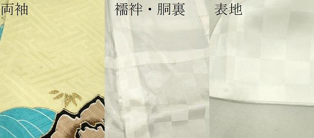 産着【化繊・五つ紋】の状態は接写画像のように両袖に薄い点シミ、襦袢の表地所々・胴裏に薄い汚れがございます。