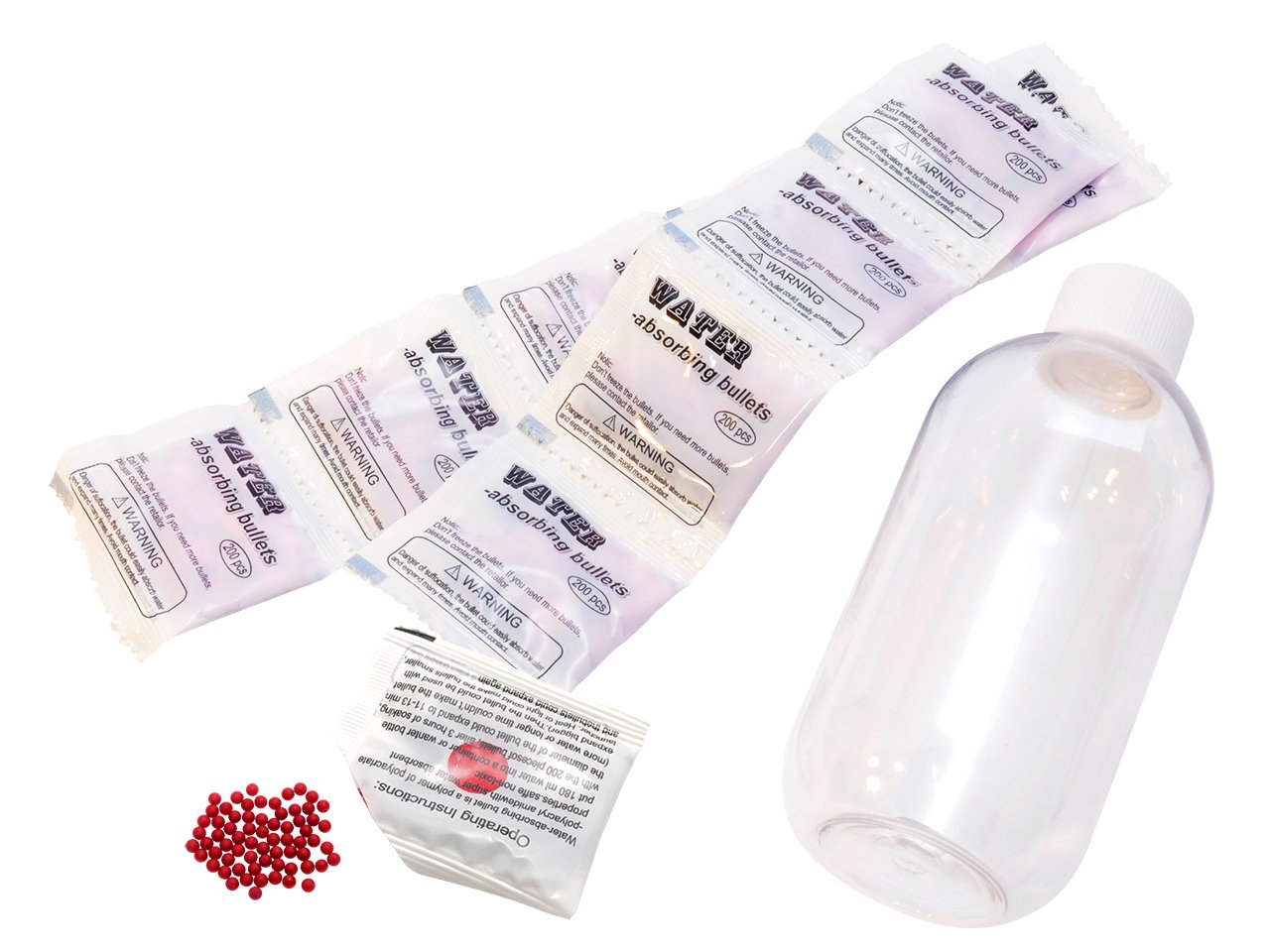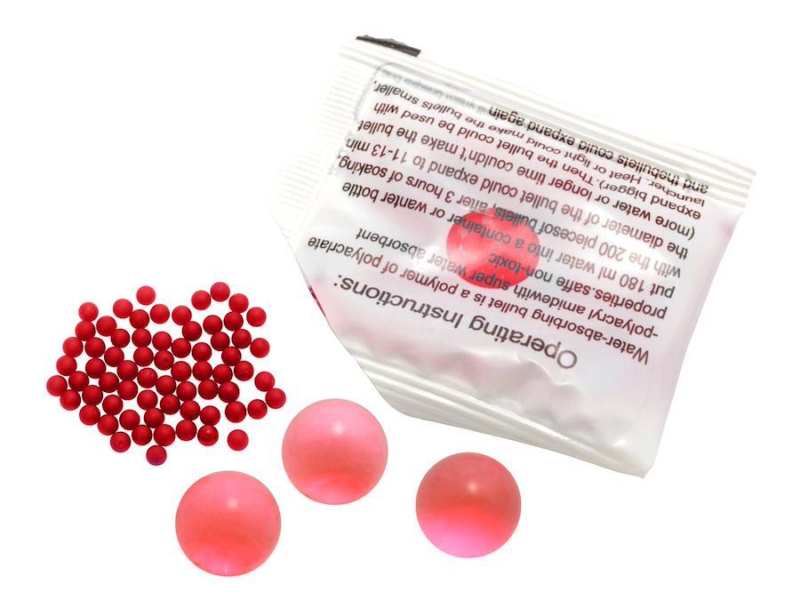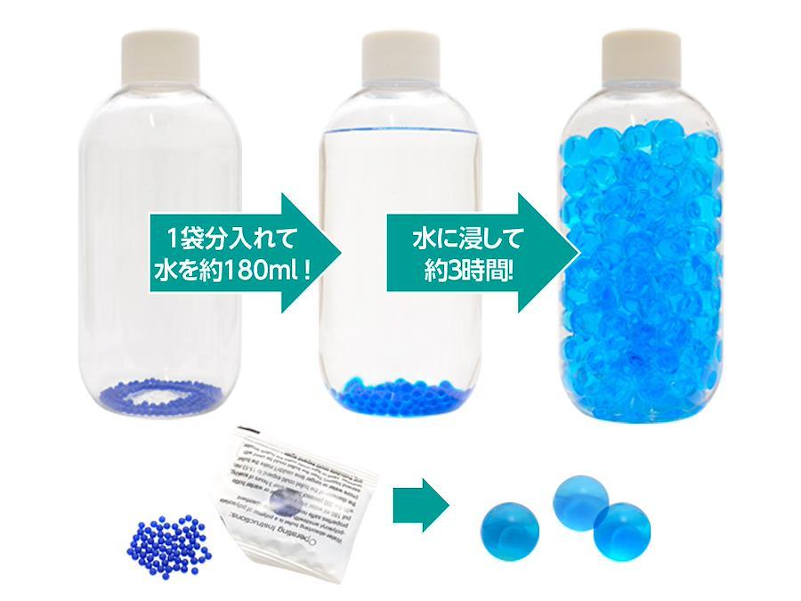 3000発のクリスタル弾と、弾作成用ボトルをセットしました。ブルーとレッドの2色設定で敵味方の振り分けにも最適です。