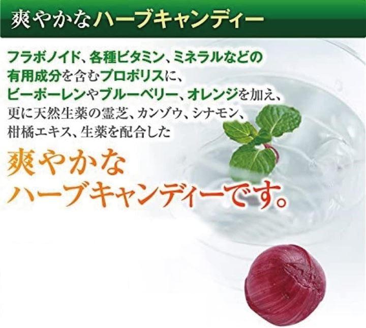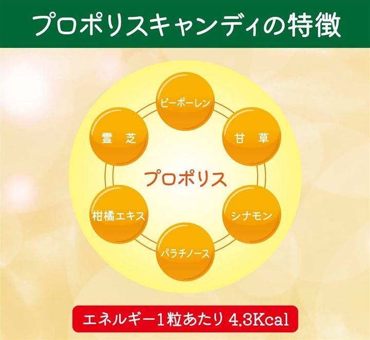 原材料:還元パラチノース(ドイツ製造)、プロポリスエキス、桂皮エキス、花粉エキス、陳皮エキス、甘草エキス、霊芝エキス/香料、甘味料(アスパルテーム・L-フェニルアラニン化合物)