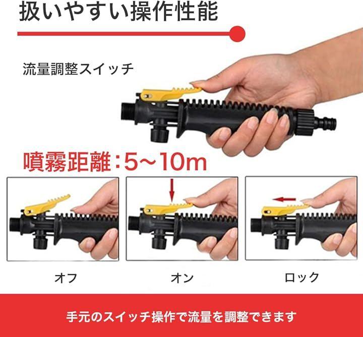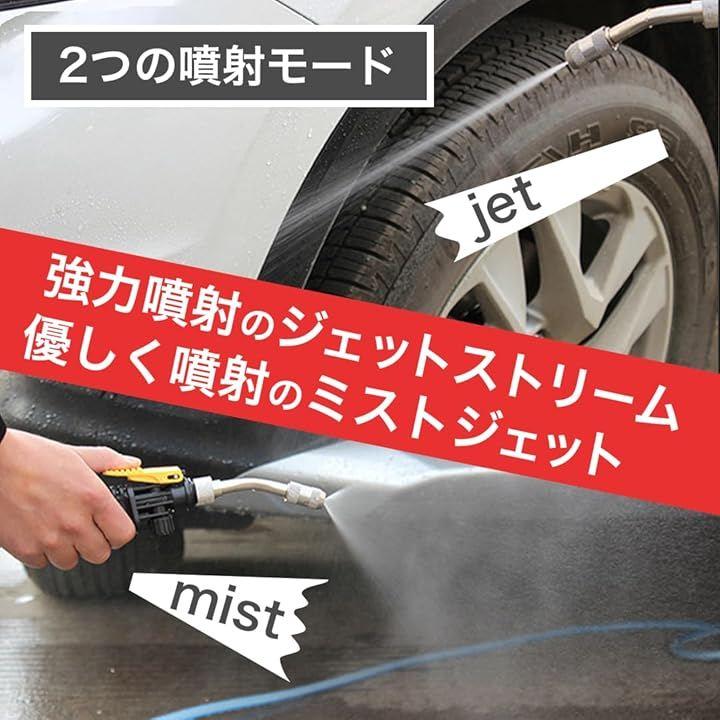 この洗車ガンは、ノズル先端のノブを回すことで噴射の広がりを調整でき、広範囲への霧状の散水から集中した水流まで自由に切り替えが可能です。