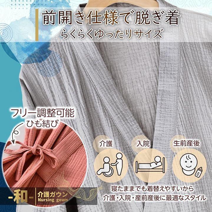腕を通すだけの前開き仕様で簡単に着脱できるため、介護パジャマや入院着として重宝します。