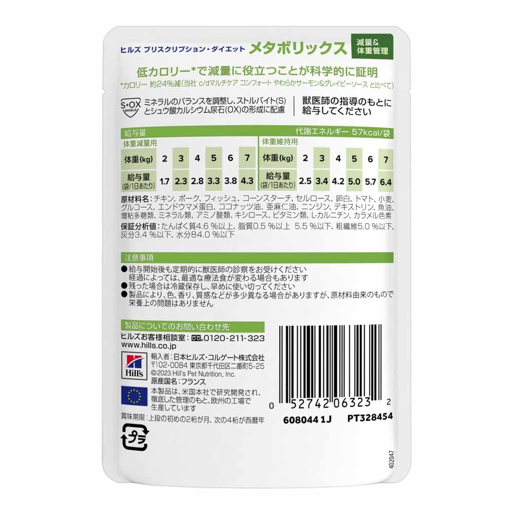 ほんの少し体重が増えるだけでも、ペットと家族が遊ぶ時間が減少してしまったり、関節への負担増などによって、生活の質(クオリティ・オブ・ライフ)が下がってしまったり、健康に影響を与える可能性があります。理想的な体重を維持することは、体重に関連する状態のリスクを減らすことにより、平均余命に影響を与えるのに役立ちます。 そんなペットのために、ヒルズの栄養学者と獣医師が開発したのが、体重管理に特化した特別療法食 ヒルズ プリスクリプション・ダイエット〈猫用〉 メタボリックス やわらかフィッシュ&グレイビーソース パウチです。この製品は、独自の原材料と低カロリーで、2ヶ月間で88%のペットの減量*に役立つことが科学的に証明された療法食です。 製品サイズ:85g