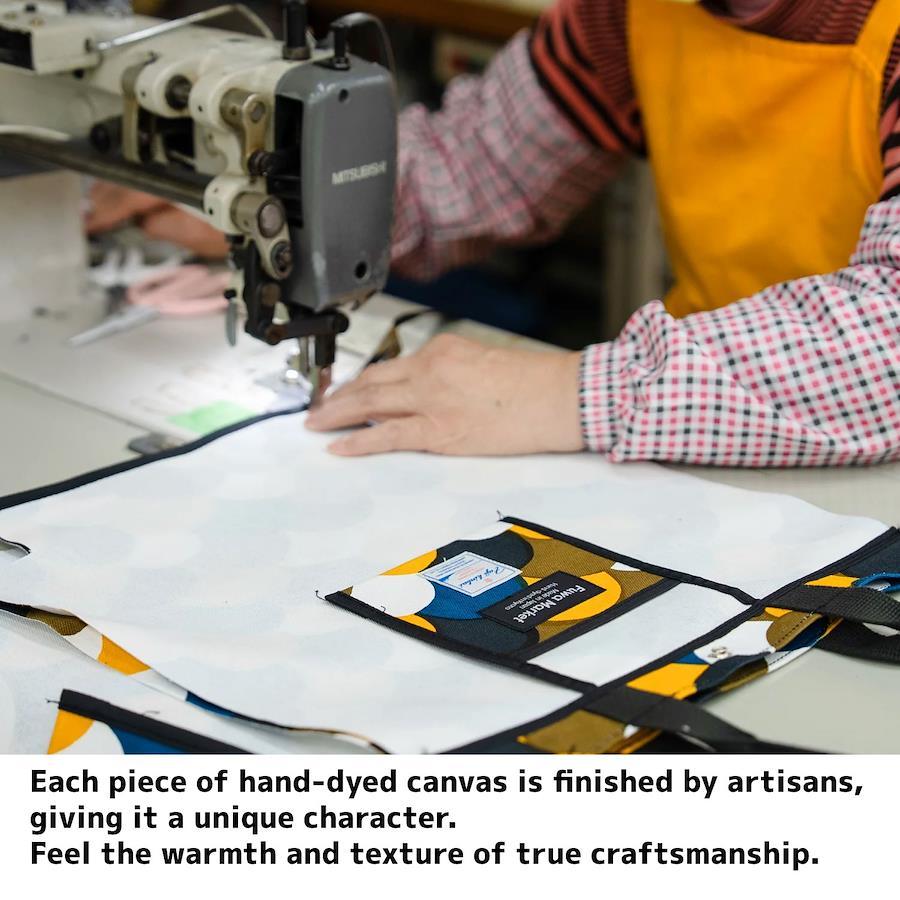 染め上がった手染め帆布生地は、職人が一点ずつ手作業で仕上げ。ひとつひとつ微妙に異なる表情が、あなただけの特別感を演出します。
