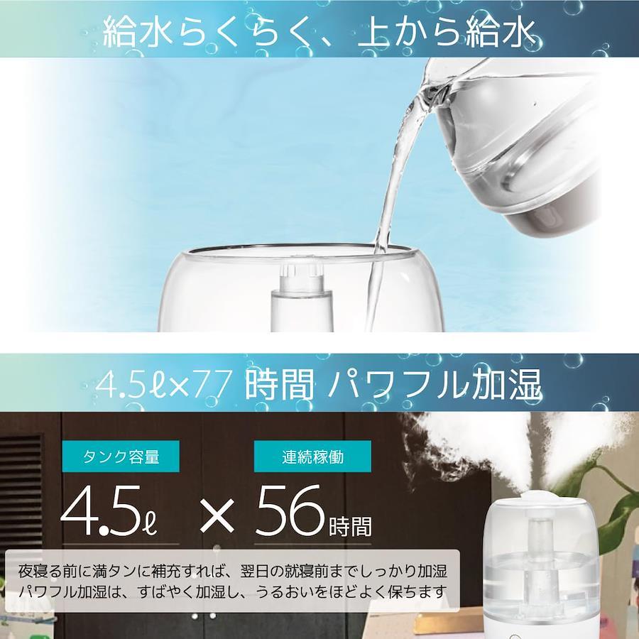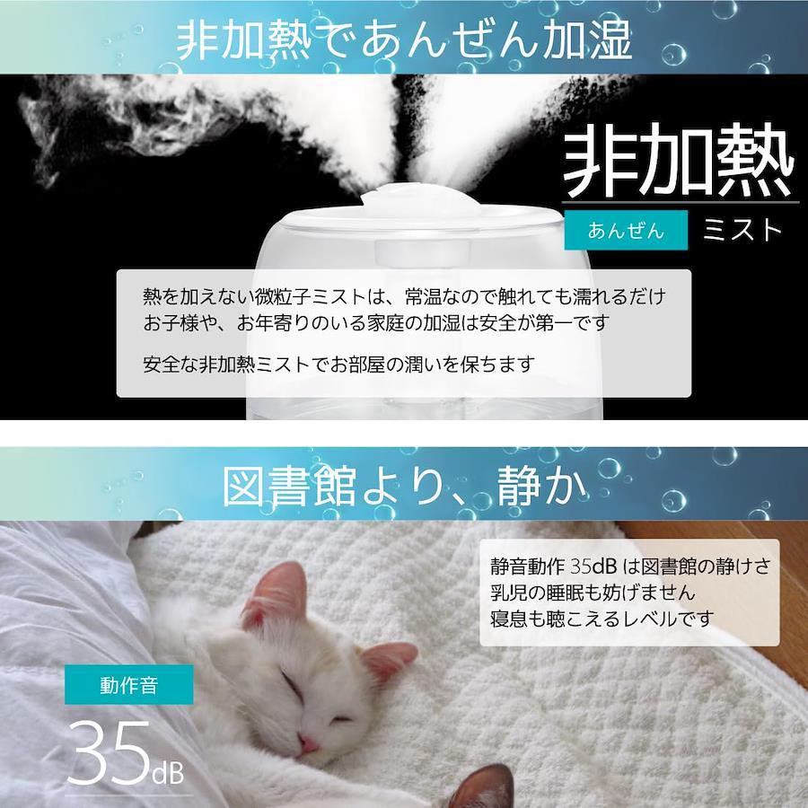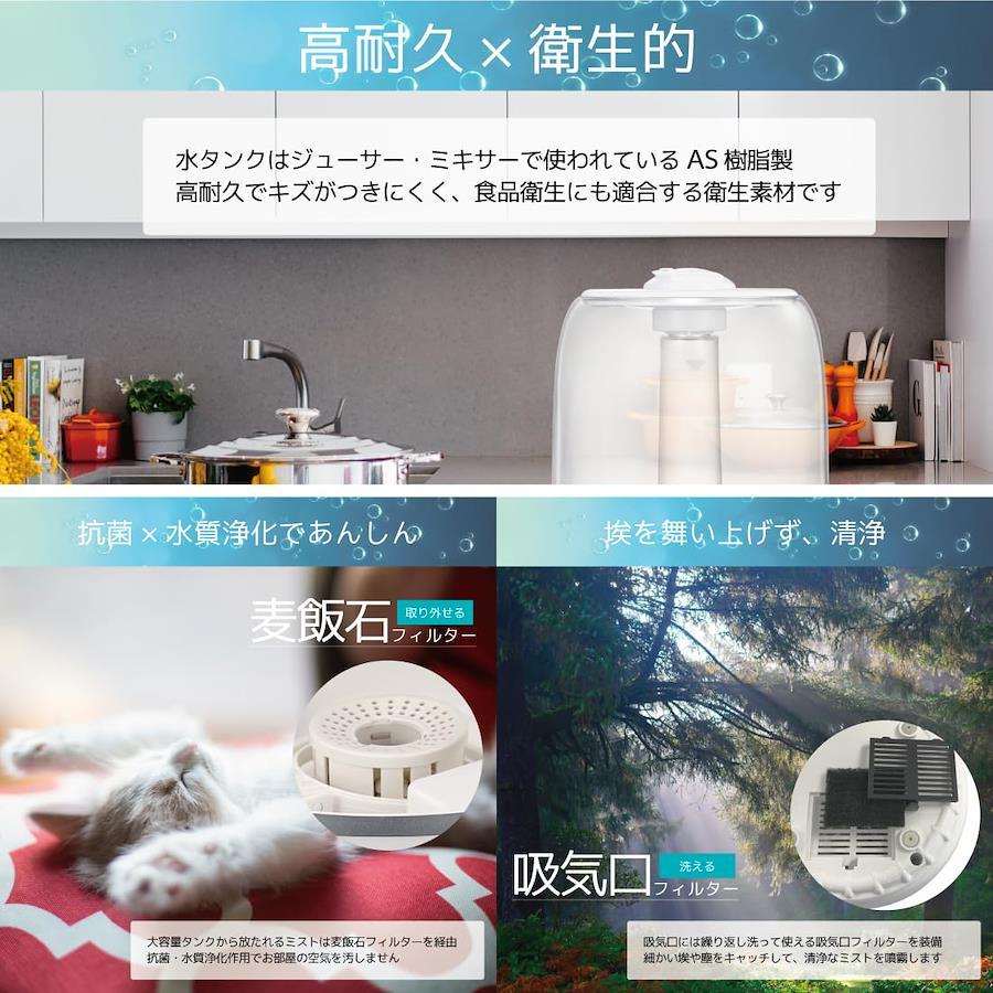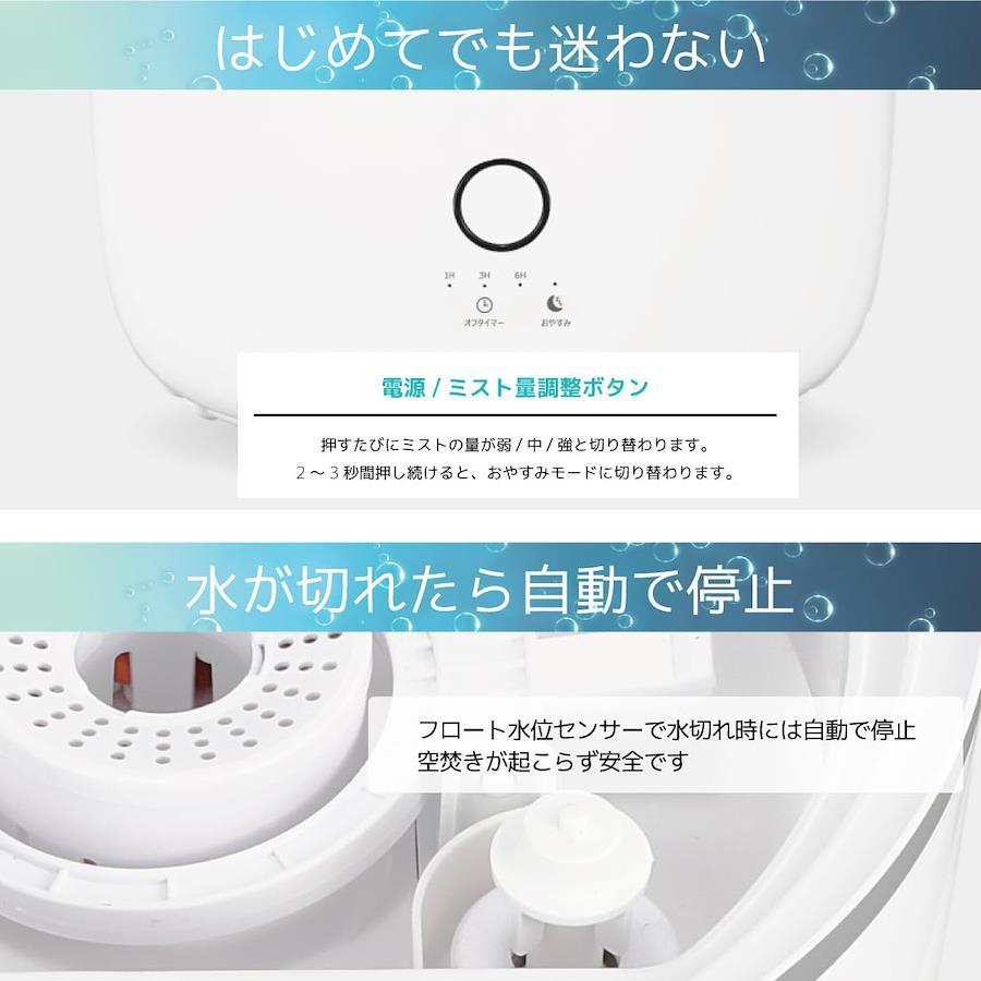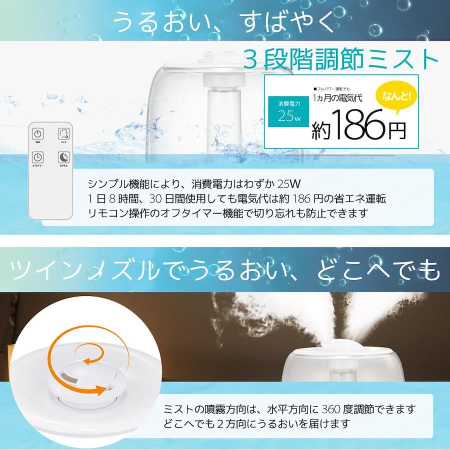 3営業日以内に発送≪新品未開封品≫:新機能「リモコン操作」& 「ツインノズル」が新たに加わりました! 大容量4.5リットルで最大77時間の連続加湿に対応しました。1回の給水で56時間連続加湿が行えるので、何度も給水する手間がいりません。 ※適用床面積(目安):6~18畳程度省エネ運転により、電気代は1ヶ月あたり約186円です。消費電力はわずか25W、1日8時間・30日間使用しても電気代は約186円、お財布にも環境にもやさしい省エネ設計です。超静音運転35dBの静けさ、無音に近いので置く場所を選びません。動いていない?と間違えるほどの静音運転、お休みしているお子様や・お年寄りの側でも気になりません。手に触れても安全な、非加熱による常温ミストは空気も汚しません。熱を加えない常温ミストなので手に触れても濡れるだけ、安全設計なので火傷の心配もありません。さらに 、麦飯石フィルターを経由。抗菌・水質浄化作用でお部屋の空気を汚しません。本体寸法:約220(W)×220(D)×290(H)mm / 電源:AC100V 50/60Hz / 消費電力:最大25W