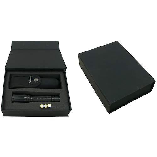 本体サイズ:37×37×140mm付属品:ポーチ、テスト用アルカリ電池×3本使用電源:単4乾電池×3本、点灯パターン:ノーマル→OFF→ハイモード→OFF→ローモード→OFF、【点灯時間】ノーマルモード:約1時間、ハイモード:約30分、ローモード:約2時間ピーク波長:365nm、使用LED:ナイトライド社製チップ型LED本体重量(kg):0.18素材: