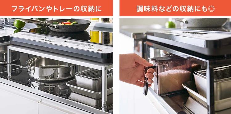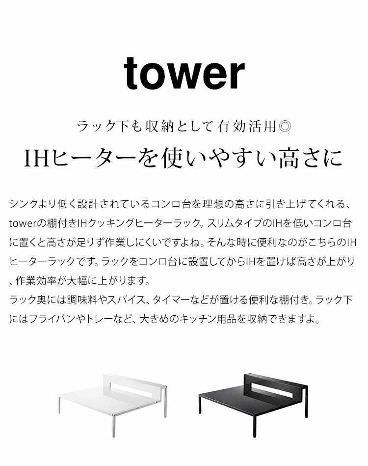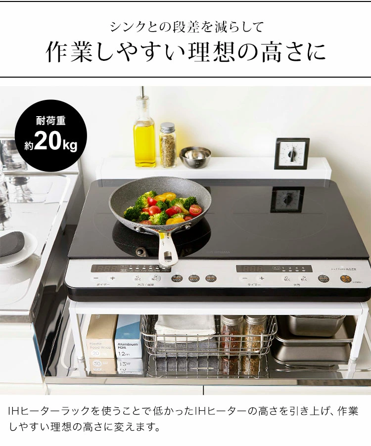 【棚付きIHクッキングヒーターラック】ihヒーターを使いやすい高さに引き上げるタワーの棚付きihクッキングヒーターラックです。シンクより低く設計されているコンロ台を理想の高さに引き上げてくれ、腰への負担を軽減してくれます。コンロ奥に収納棚付きで調味料やタイマーなどを置くことができます。ラック下はフライパンやトレーなど大きめのキッチン用品を収納できます。