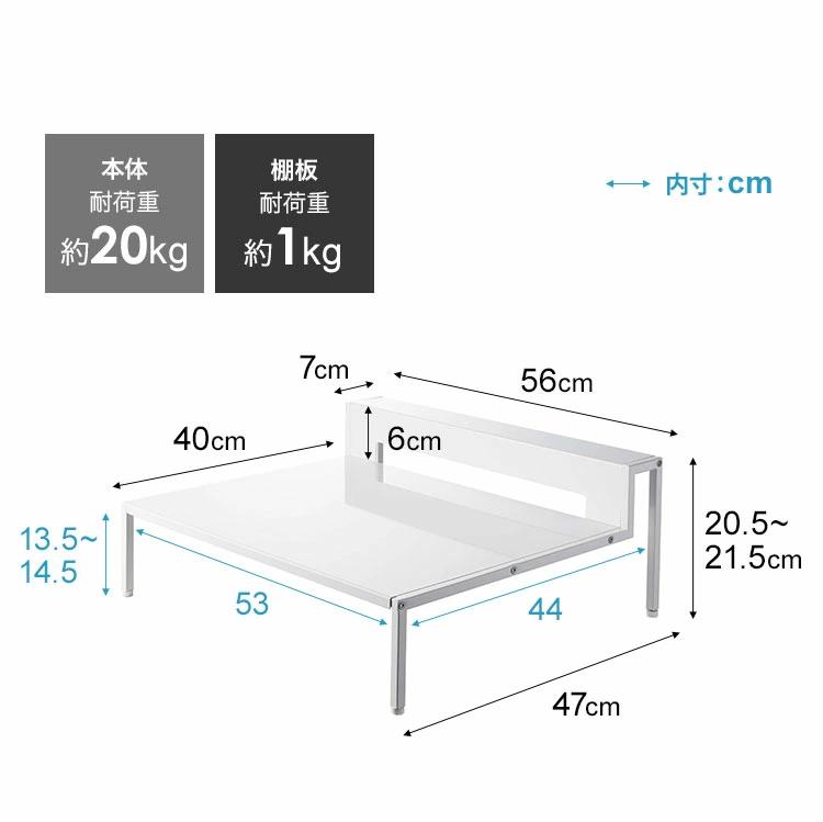 内寸収納部:約W56×D40cm棚:約W56×D7×H6cmラック下収納部:約W53×D44×H13.5~14.5cm収納部背面:約W42×H3cm対応幅約56cm・奥行き約47cm以上のコンロ台