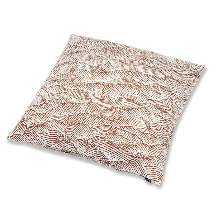 大海に悠々とうねる白波、永遠に寄せては返すことから「永遠・不滅・誕生・長寿」の意味を持つとされました。今にも溢れ出てきそうな生き生きとした波間には、光を受けて金色に輝く波頭が現れるよう金加工を施し、落ち着いた色味が海の雄大さを感じさせます。一見、和の要素を強く感じる柄ですが、シンプルな色使いなので現代の空間にも活きるデザインです。生地はざっくりとした織目で、手になじみの良い変わり織りです。【カバーサイズ】 横45㎝×縦45㎝【生地素材】 綿(変わり織り)100%この商品はカバー(ファスナー加工)のみです。中わたは別途ご購入ください。またカートの購入可能数より多い数をご希望の場合はご相談ください。