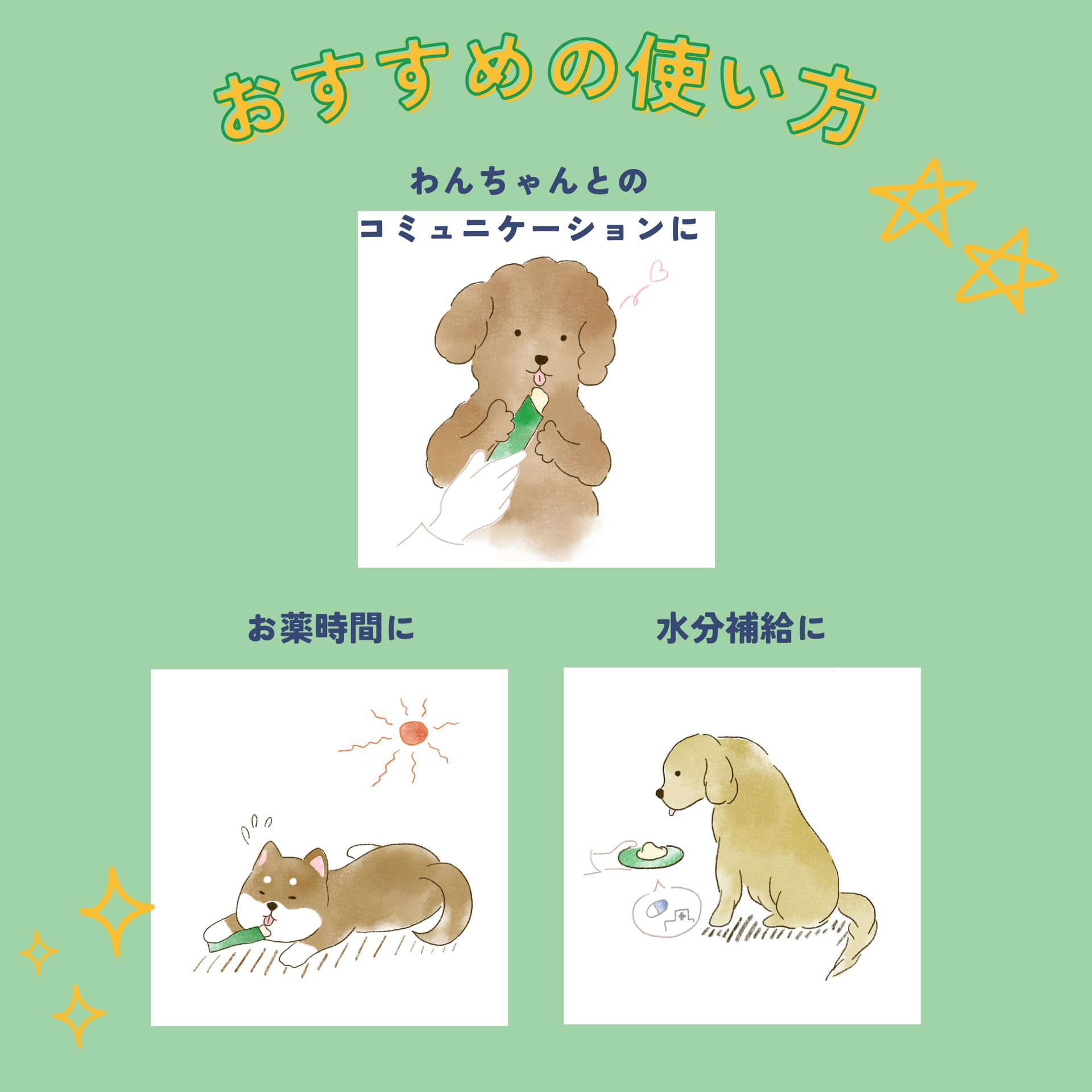 ドライフードと併用する場合は本製品4本につきドライフードを約15g減らしてください。本製品のみを与える場合は愛犬の体重に応じて以下量を目安に1日2回に分けてお与えください。 3㎏:17本/日 5㎏:25本/日 8㎏:35本/日 10㎏:42本/日