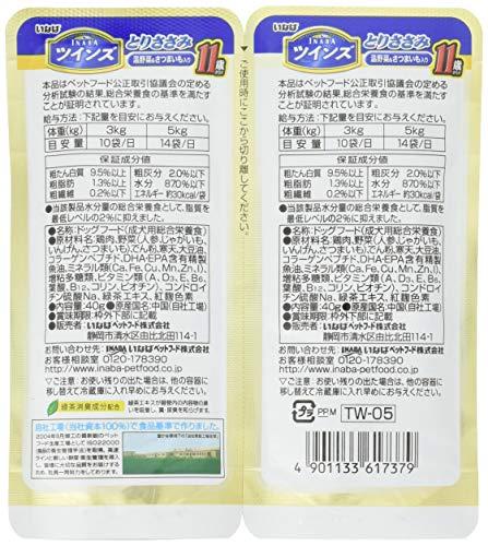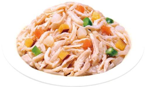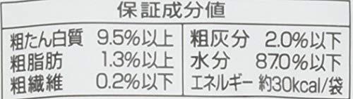 鶏肉(ささみ)、野菜(人参、じゃがいも、いんげん、さつまいも)、大豆油、でん粉、寒天、コラーゲンペプチド、DHA・EPA含有精製魚油、ミネラル類(Ca、Zn、Cu、Mn、Fe)、増粘多糖類、ビタミン類(E、A、ビオチン、D3、葉酸、B6)、コンドロイチン硫酸Na、緑茶エキス、紅麹色素