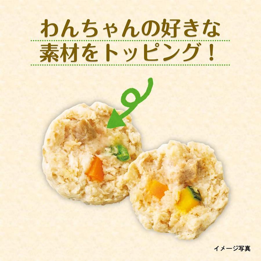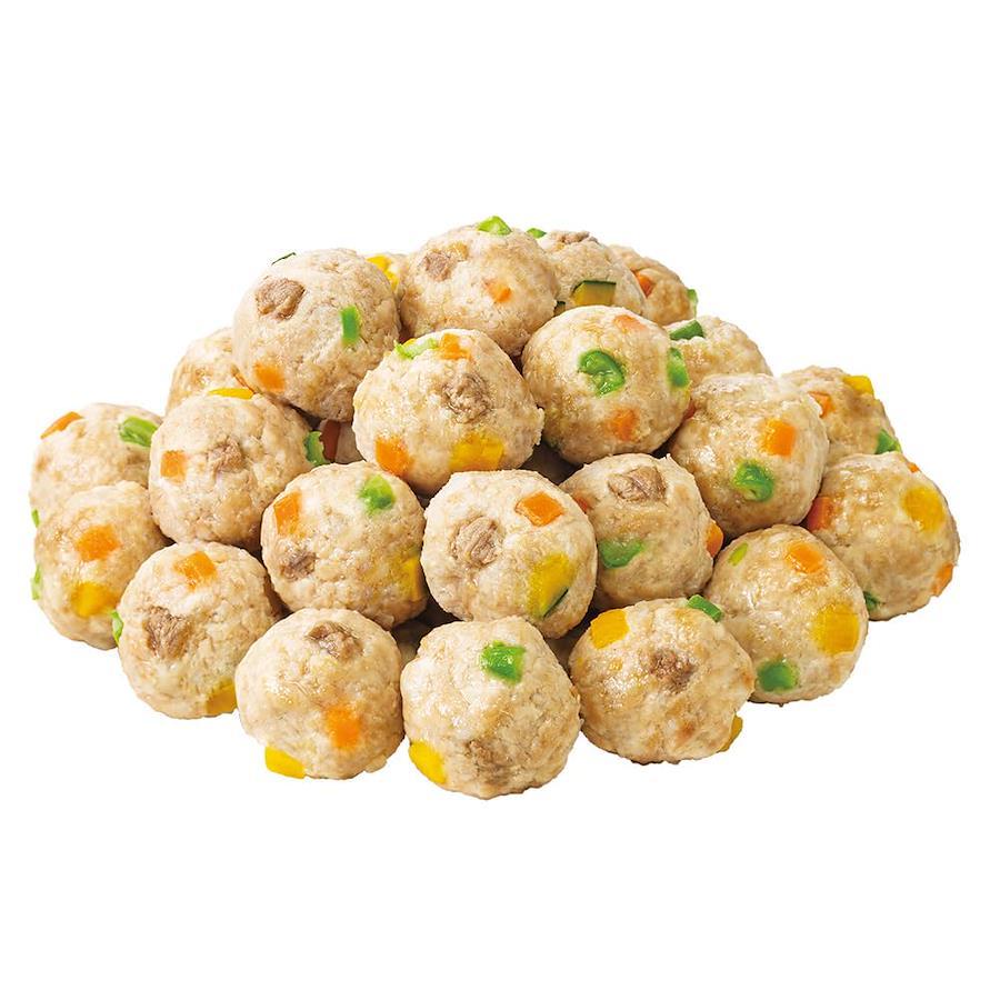 ヒト基準の食品素材で作ったこだわりのチキンボール。国産鶏肉のつくねに、わんちゃんの喜ぶ素材をトッピングしました。急速凍結で、いつでも出来立てのおいしさを味わえます。総合栄養食のため、主食としてお与えいただけます。