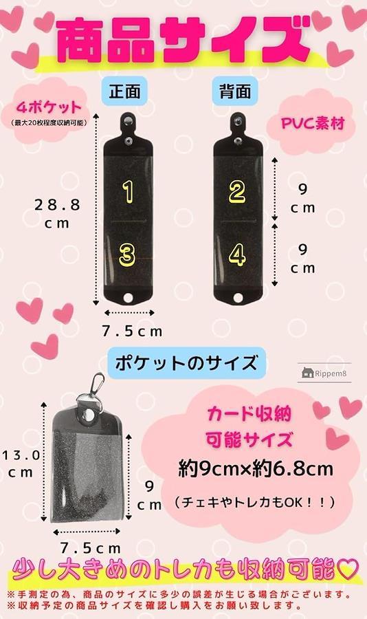 ・フック付きで好きなところに取付可能で、持ち運びに便利。 「おすすめポイント」 ・4ポケットあり、最大20枚程度収納可能な大容量。。(少し大きめのトレカも収納可能。