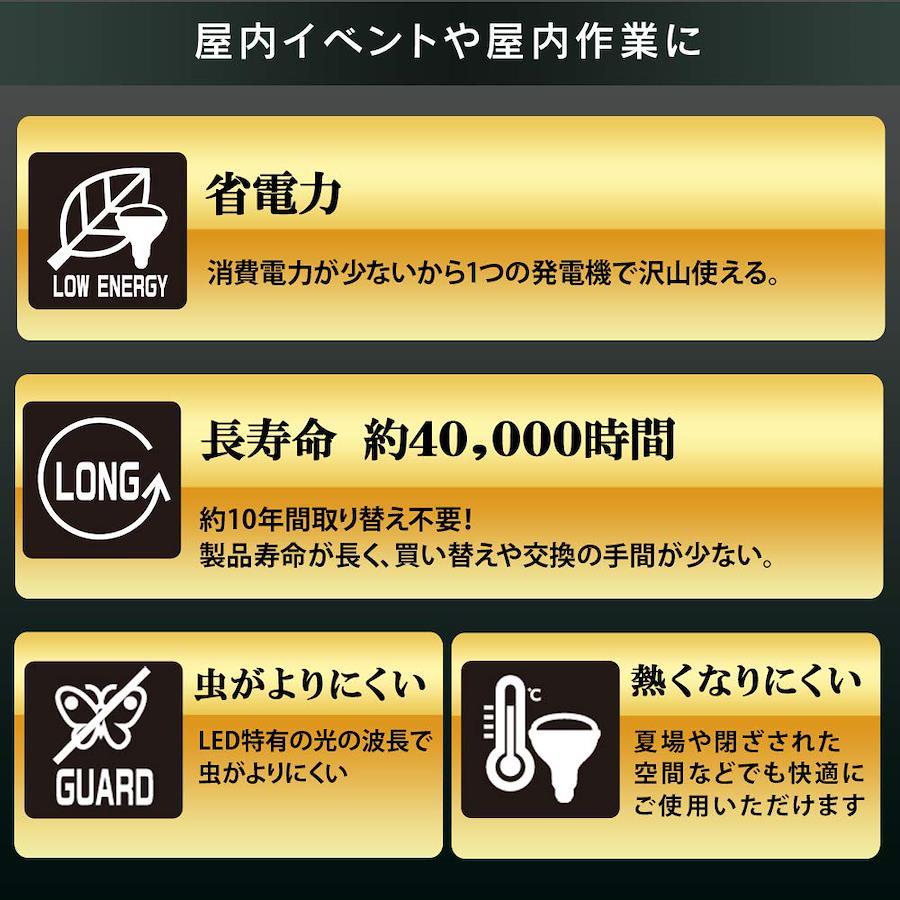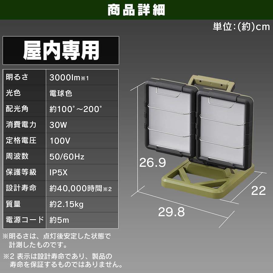 ◇省電力消費電力30Wなので、ひとつの発電機でたくさん使える。◇長寿命製品寿命が長いから、買い替えや交換の手間が少ない。◇虫がよりにくいLED特融の光の波長で虫が寄りにくい。◇熱くなりにくい白熱球に比べ光線に熱が少なく夏場や閉ざされた空間でも快適。全光束:3000lm(ハロゲンランプ150形相当)光源色:電球色●電源:AC100V 50/60Hz設置場所:屋内専用●電源コード長さ:約5m商品サイズ(cm):幅約29.8×奥行約22.06×高さ約26.95●重量:約2.15kg消費電力:30W●定格入力電流:0.3A●設計寿命:40000時間保護等級:IP5X●配光角:約110~200°
