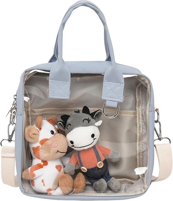 透明窓つきの表面は、約20x20cmの広いクリア窓なので、中身がよく見え、お気に入りのぬいや缶バッジを可愛く飾れる“見せるバッグ”。