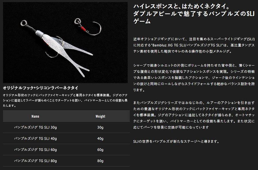 スーパーライトジギング(SLJ)に対応する”Bambluz JIG TG SLJ/バンブルズジグTG SLJ”は、高比重タングステン素材を使用した軽快でキレのある操作性の小型メタルジグ。シャープで細身シルエットの片側にボリュームを持たせた背中側と、薄くシャープな腹側との形状変化で俊敏なアクションレスポンスを実現。シリーズの特徴である素早いレスポンスを踏襲したアクションで、ジャーク後のラインテンションの抜けと同時にロールしながらスライドフォールする絶妙なバランス設計を誇ります。またバンブルズジグシリーズではおなじみの、ルアーのアクションを引き出すための最適なオリジナル形状のフックにバックファイヤーキャップと専用ネクタイを標準装備。ジグのアクションに追従してネクタイが揺らめき、オートマチックにターゲットを誘い、バイトマーカーとしての役割も果たします。また状況に応じてパーツを容易に交換が可能になっています