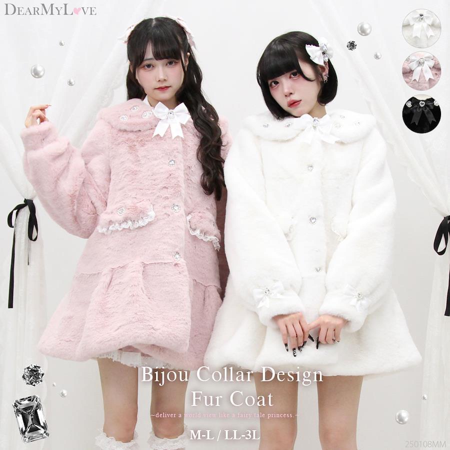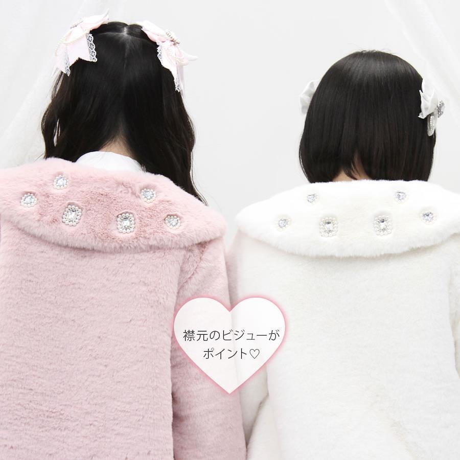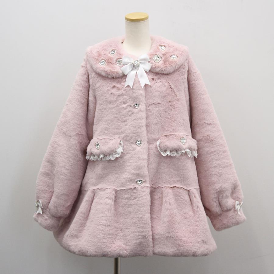 キラキラビジューが散りばめられたふわふわのかわいいファーコート【デザイン】襟元の大きめキラキラビジューが散りばめられたかわいいファーコートです♪ボタンにもかわいいハートパールビジューがポイントに♪ボタンはスナップボタンで楽ちんに着脱できます。ふわっとひろがるデザインでどんなお洋服にも合わせられるコートです。【素材】ファー素材を使用しています。裏地は中綿キルティング仕様になっています。【コーディネート】量産型コーデや甘めロリータ系コーデにぴったりのファーコートです。おもわず抱きしめたくなるくらいかわいいボリューム感がたまらない♪《透け感》なし 《生地の厚さ》厚手 《裏地》あり 《伸縮性》なし《生産国》中国
